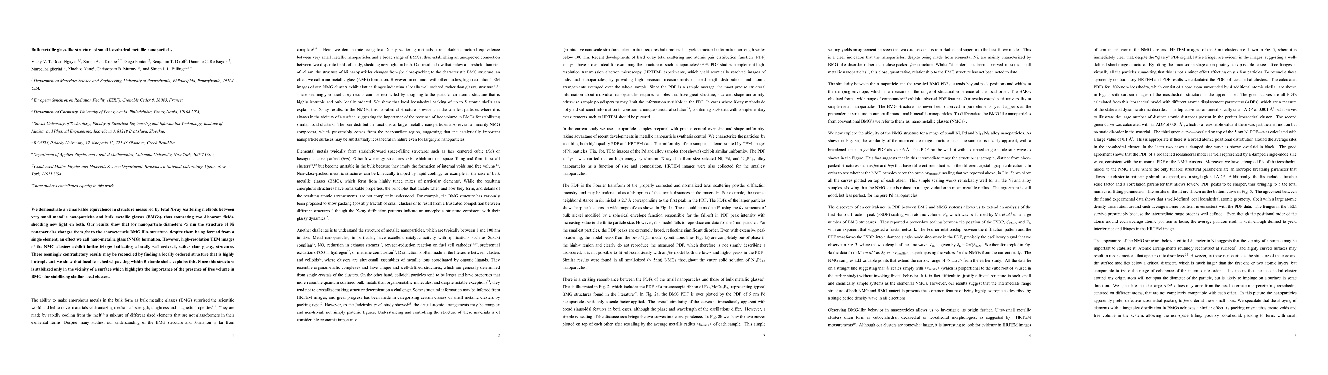 This paper demonstrates the structural equivalence between small metallic nanoparticles and bulk metallic glasses via X-ray scattering, revealing that Ni nanoparticles under 5 nm form a nano-metallic glass-like structure. Despite local lattice order observed in TEM, the study finds that these nanoparticles exhibit an icosahedral packing, highlighting the role of surface-induced free volume in stabilizing such structures.