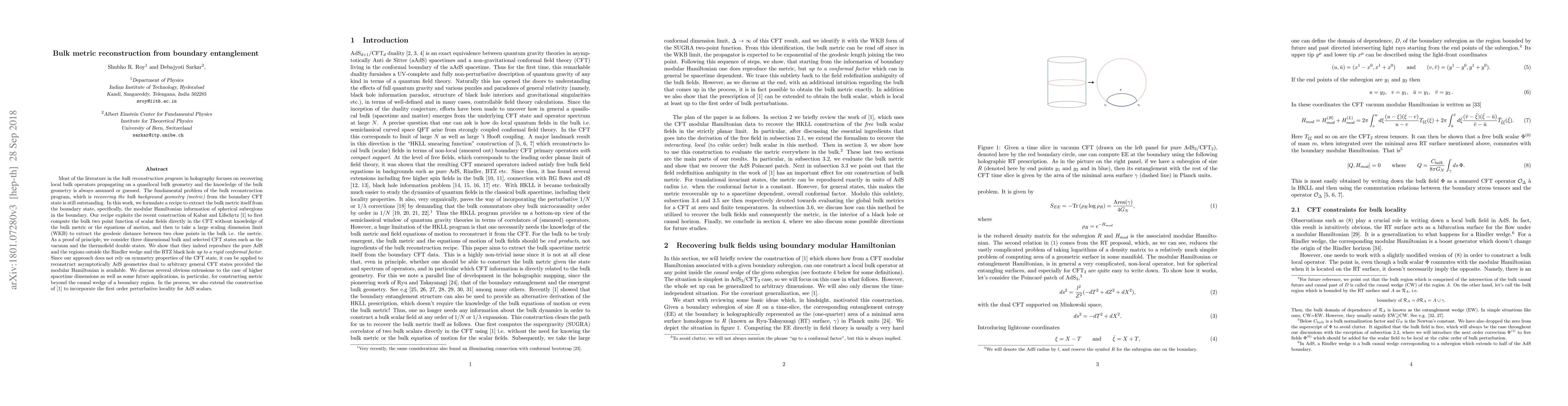This paper proposes a method to reconstruct the bulk metric from boundary entanglement entropy, specifically using the modular Hamiltonian information of spherical subregions. It leverages Kabat and Lifschytz's construction to compute the bulk two-point function in the CFT without prior knowledge of the bulk metric, and then applies a large scaling dimension limit to extract the bulk metric up to a conformal factor.