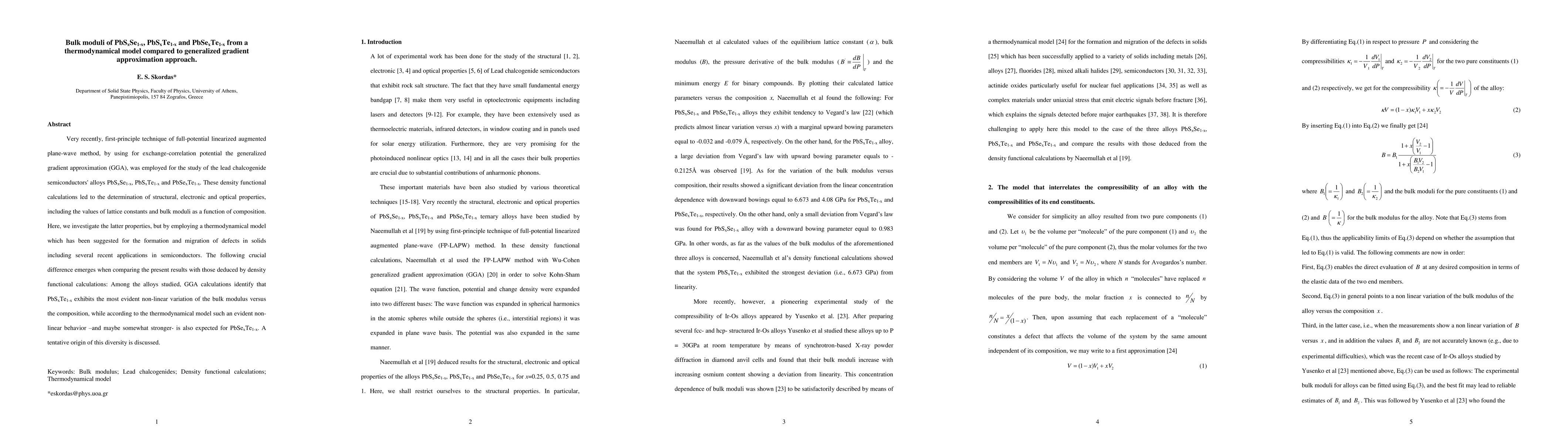 Researchers compare bulk moduli of PbSxSe1-x, PbSxTe1-x, and PbSe XuTe1-x alloys using a thermodynamic model versus GGA calculations, finding non-linear variations in PbSxTe1-x and potentially stronger variations in PbSe x Te 1 - x.