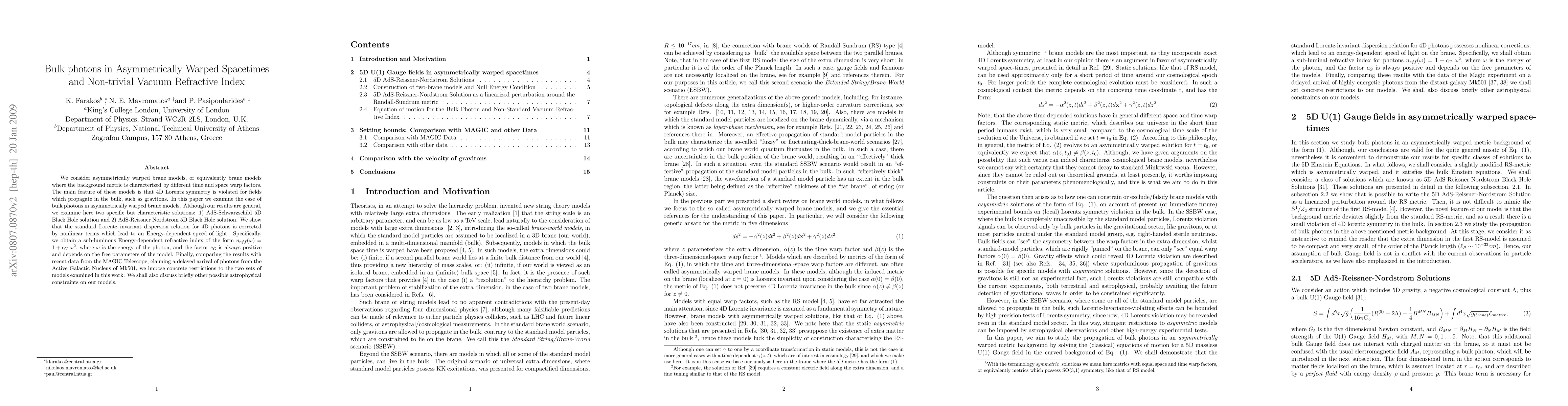 This paper investigates asymmetrically warped brane models, where 4D Lorentz symmetry is violated for bulk fields, focusing on bulk photons. It derives an Energy-dependent refractive index, n_{eff}(\omega)=1+c_{G} \omega^2, and discusses implications for the speed of light, comparing results with MAGIC Telescope data on photon arrival times from Mk501.