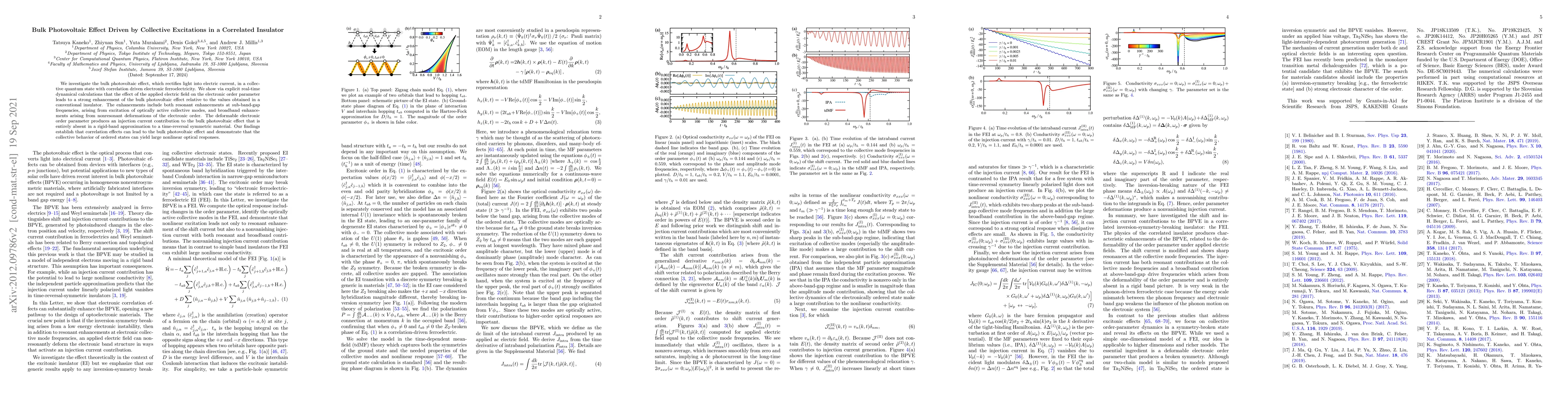 We investigate the bulk photovoltaic effect, which rectifies light into electric current, in a collective quantum state with correlation driven electronic ferroelectricity. We show via explicit real-time dynamical calculations that the effect of the applied electric field on the electronic order parameter leads to a strong enhancement of the bulk photovoltaic effect relative to the values obtained in a conventional insulator. The enhancements include both resonant enhancements at sub-band-gap frequencies, arising from excitation of optically active collective modes, and broadband enhancements arising from nonresonant deformations of the electronic order. The deformable electronic order parameter produces an injection current contribution to the bulk photovoltaic effect that is entirely absent in a rigid-band approximation to a time-reversal symmetric material. Our findings establish that correlation effects can lead to the bulk photovoltaic effect and demonstrate that the collective behavior of ordered states can yield large nonlinear optical responses.