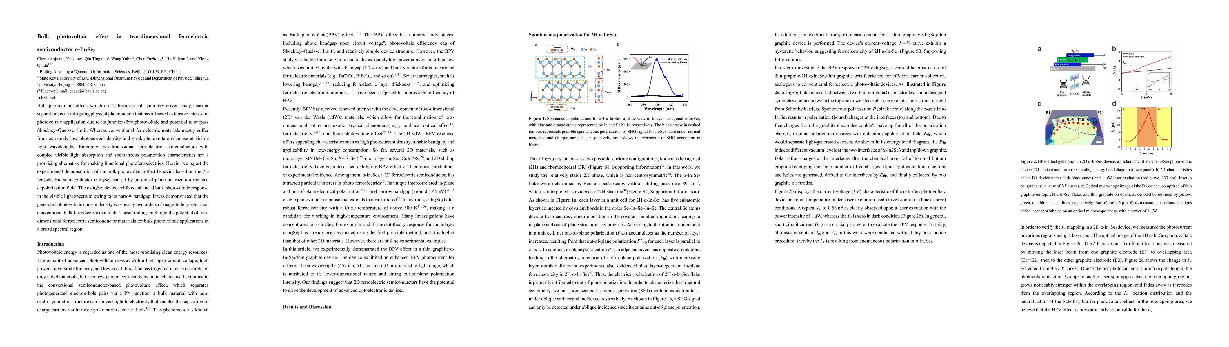 This research demonstrates a significant bulk photovoltaic effect in the 2D ferroelectric semiconductor $\alpha$-In$_2$Se$_3$, showing a nearly two orders of magnitude greater photocurrent density compared to conventional materials. The study highlights the potential of 2D materials for advanced photovoltaic applications due to their enhanced visible light response.