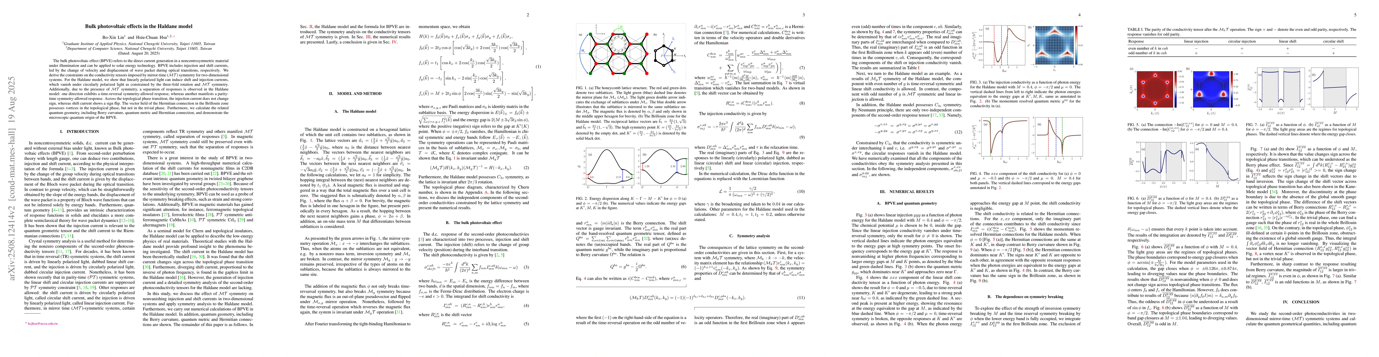 The paper presents a detailed symmetry analysis of second-order photoconductivities in two-dimensional MT-symmetric systems and calculates quantum geometrical quantities for the Haldane model, providing a deeper understanding of the BPVE.