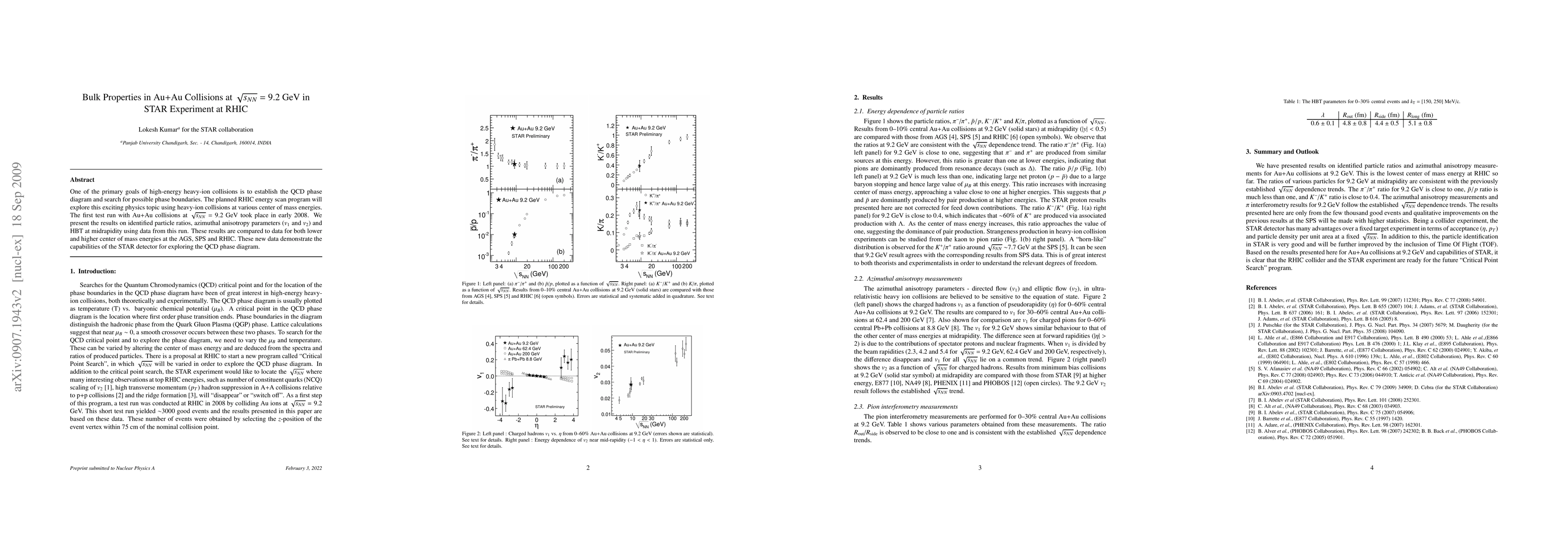 The STAR experiment at RHIC conducted a test run of Au+Au collisions at 9.2 GeV, revealing results on particle ratios, azimuthal anisotropy, and Hanbury Brown-Twiss (HBT) at midrapidity. These findings, compared to data from lower and higher energies, demonstrate STAR's capability to explore the QCD phase diagram.