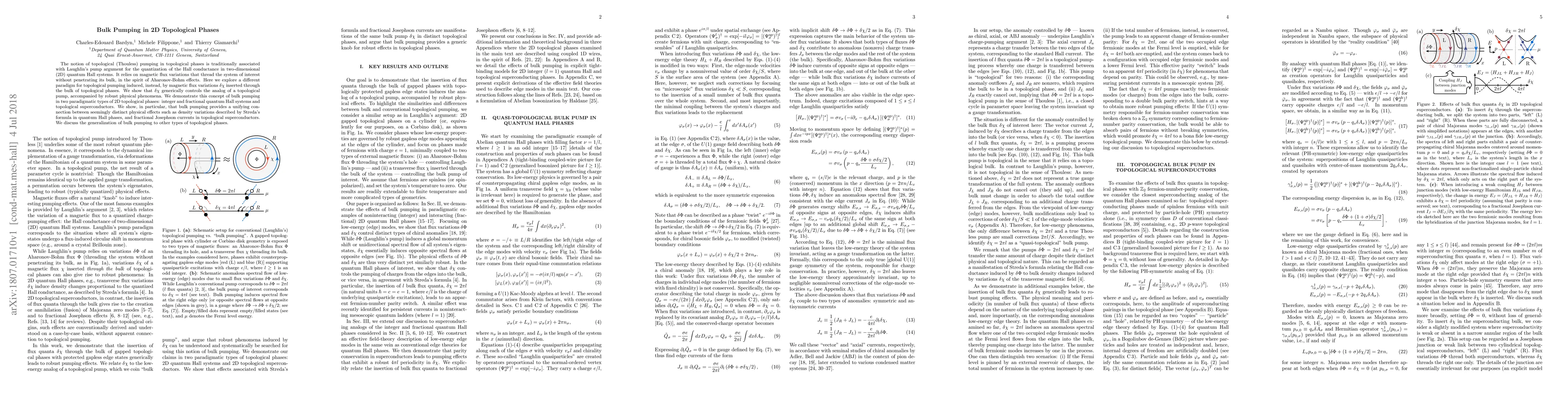 This paper explores a novel concept of bulk pumping in 2D topological phases, where magnetic flux variations inserted through the bulk induce topological pumping effects. The study demonstrates the robustness of bulk pumping in integer and fractional quantum Hall systems and topological superconductors, revealing a unifying connection between density variations and fractional Josephson currents.