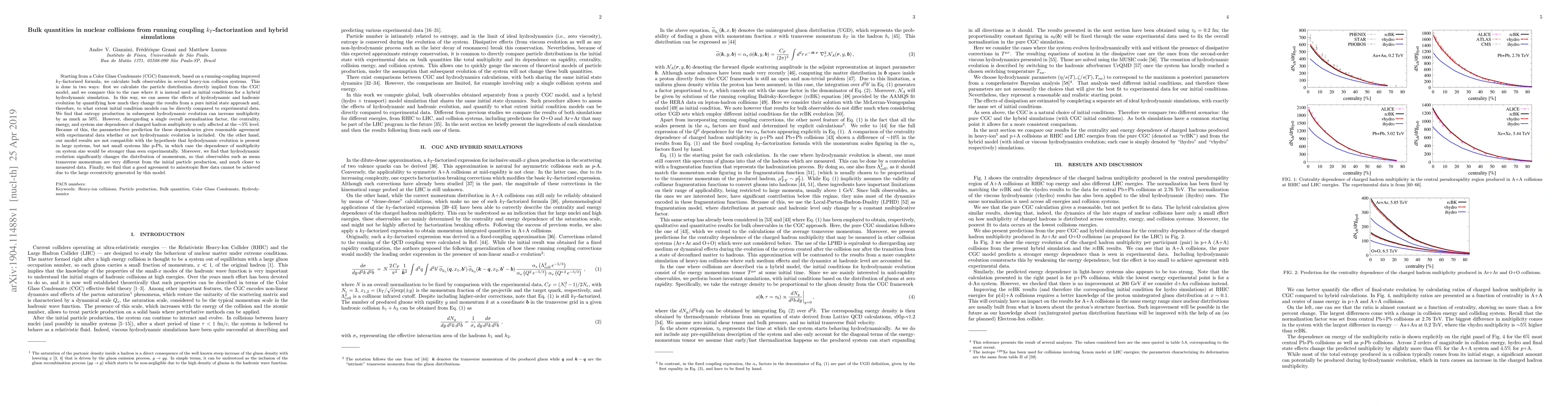 This paper uses a running-coupling improved $k_T$-factorization approach within the Color Glass Condensate framework to calculate bulk observables in heavy-ion collisions, comparing direct CGC predictions to hybrid hydrodynamic simulations. It finds that hydrodynamic evolution significantly alters momentum distributions and multiplicities, yet centrality, energy, and system size dependencies remain consistent at the 5% level, providing reasonable agreement with experimental data despite the absence of hydrodynamic evolution in small systems.