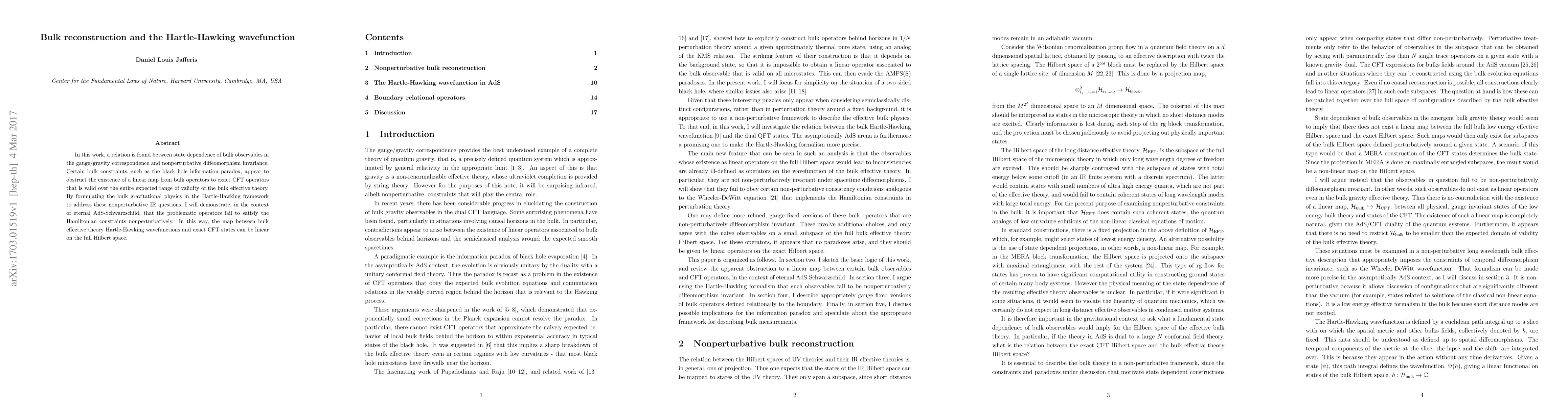 In this work, a relation is found between state dependence of bulk observables in the gauge/gravity correspondence and nonperturbative diffeomorphism invariance. Certain bulk constraints, such as the black hole information paradox, appear to obstruct the existence of a linear map from bulk operators to exact CFT operators that is valid over the entire expected range of validity of the bulk effective theory. By formulating the bulk gravitational physics in the Hartle-Hawking framework to address these nonperturbative IR questions, I will demonstrate, in the context of eternal AdS-Schwarzschild, that the problematic operators fail to satisfy the Hamiltonian constraints nonperturbatively. In this way, the map between bulk effective theory Hartle-Hawking wavefunctions and exact CFT states can be linear on the full Hilbert space.