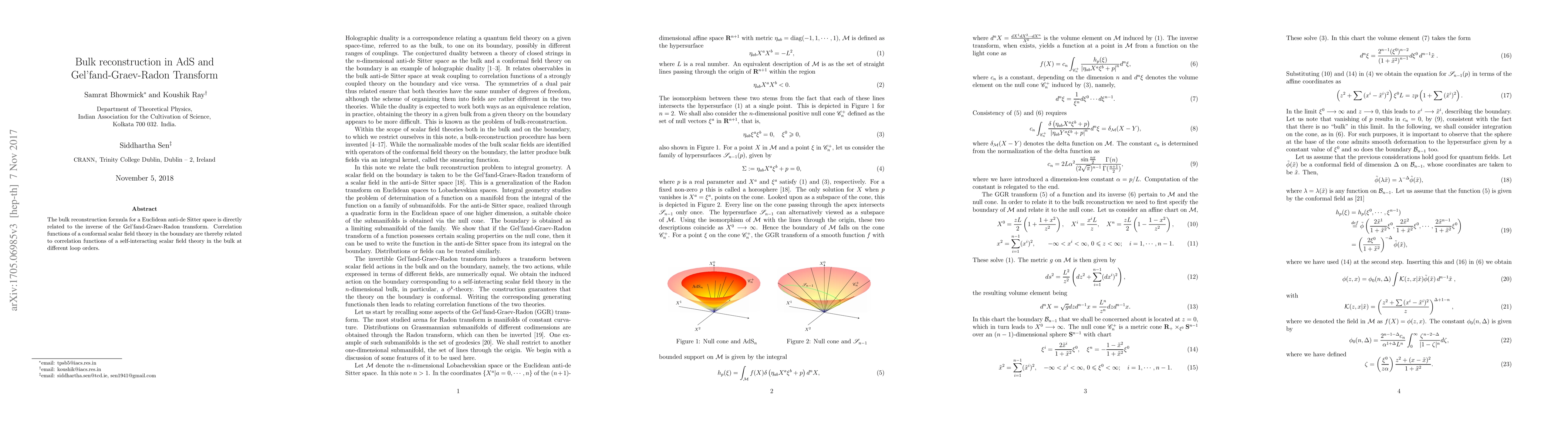 The bulk reconstruction formula for a Euclidean anti-de Sitter space is directly related to the inverse of the Gel'fand-Graev-Radon transform. Correlation functions of a conformal scalar field theory in the boundary are thereby related to correlation functions of a self-interacting scalar field theory in the bulk at different loop orders.