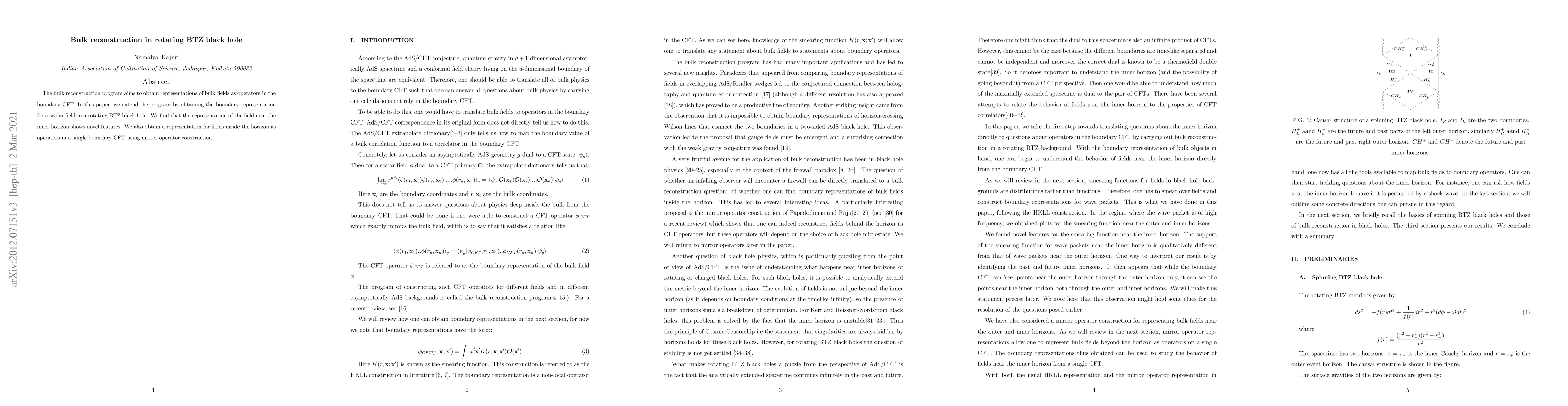 The bulk reconstruction program aims to obtain representations of bulk fields as operators in the boundary CFT. In this paper we extend the program by obtaining the boundary representation for a scalar field in a rotating BTZ black hole. We find that the representation of the field near the inner horizon shows novel features. We also obtain a representation for fields inside the horizon as operators in a single boundary CFT using mirror operator construction.