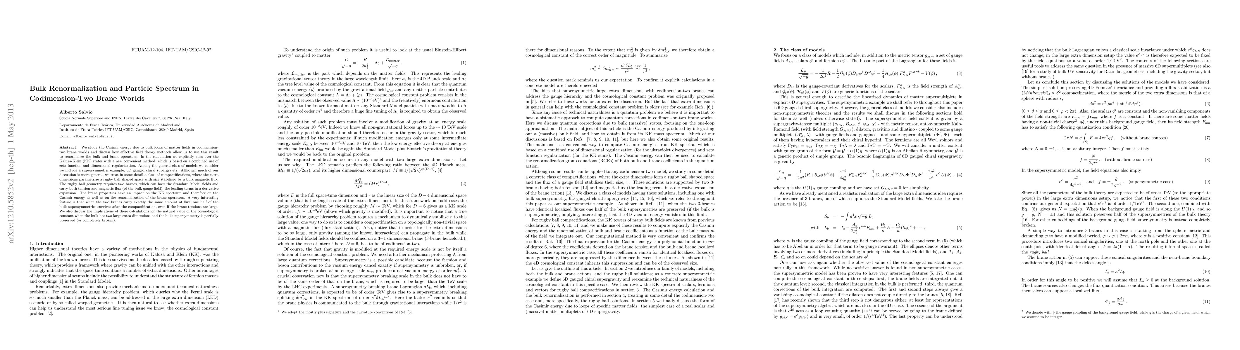 We study the Casimir energy due to bulk loops of matter fields in codimension-two brane worlds and discuss how effective field theory methods allow us to use this result to renormalize the bulk and brane operators. In the calculation we explicitly sum over the Kaluza-Klein (KK) states with a new convenient method, which is based on a combined use of zeta function and dimensional regularization. Among the general class of models we consider we include a supersymmetric example, 6D gauged chiral supergravity. Although much of our discussion is more general, we treat in some detail a class of compactifications, where the extra dimensions parametrize a rugby ball shaped space with size stabilized by a bulk magnetic flux. The rugby ball geometry requires two branes, which can host the Standard Model fields and carry both tension and magnetic flux (of the bulk gauge field), the leading terms in a derivative expansion. The brane properties have an impact on the KK spectrum and therefore on the Casimir energy as well as on the renormalization of the brane operators. A very interesting feature is that when the two branes carry exactly the same amount of flux, one half of the bulk supersymmetries survives after the compactification, even if the brane tensions are large. We also discuss the implications of these calculations for the natural value of the cosmological constant when the bulk has two large extra dimensions and the bulk supersymmetry is partially preserved (or completely broken).