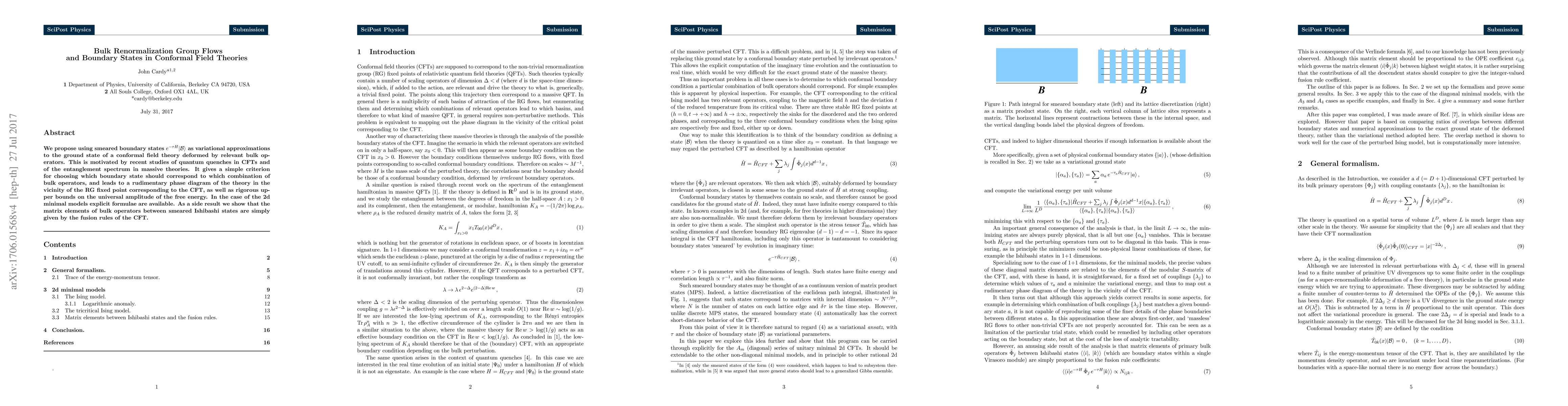 We propose using smeared boundary states $e^{-\tau H}|\cal B\rangle$ as variational approximations to the ground state of a conformal field theory deformed by relevant bulk operators. This is motivated by recent studies of quantum quenches in CFTs and of the entanglement spectrum in massive theories. It gives a simple criterion for choosing which boundary state should correspond to which combination of bulk operators, and leads to a rudimentary phase diagram of the theory in the vicinity of the RG fixed point corresponding to the CFT, as well as rigorous upper bounds on the universal amplitude of the free energy. In the case of the 2d minimal models explicit formulae are available. As a side result we show that the matrix elements of bulk operators between smeared Ishibashi states are simply given by the fusion rules of the CFT.