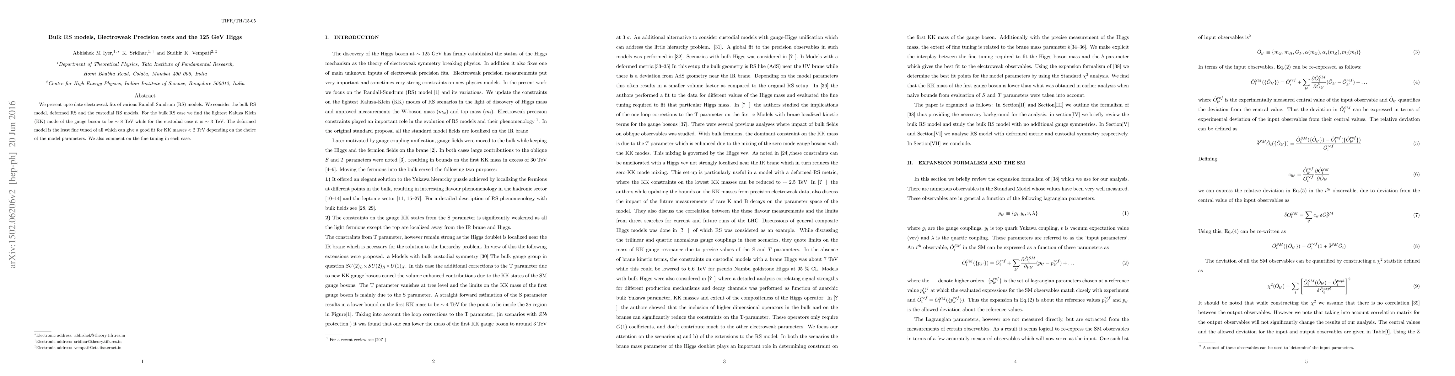 We present upto date electroweak fits of various Randall Sundrum (RS) models. We consider the bulk RS model, deformed RS and the custodial RS models. For the bulk RS case we find the lightest Kaluza Klein (KK) mode of the gauge boson to be $\sim 8$ TeV while for the custodial case it is $\sim 3$ TeV. The deformed model is the least fine tuned of all which can give a good fit for KK masses $< 2$ TeV depending on the choice of the model parameters. We also comment on the fine tuning in each case.