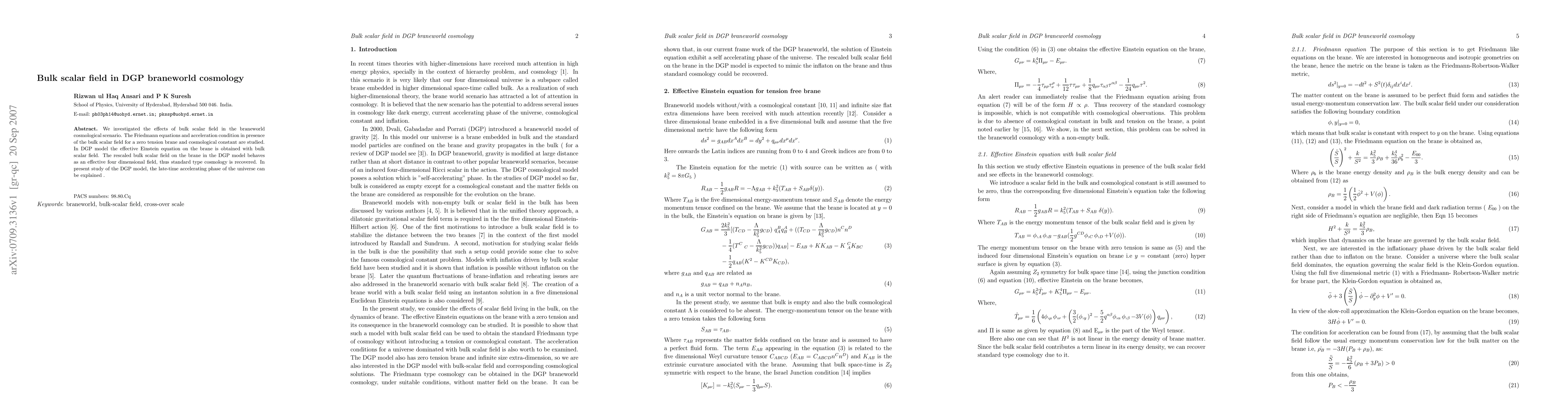 This paper examines the influence of a bulk scalar field in the DGP braneworld cosmology, deriving the modified Friedmann equations and acceleration condition. The study finds that the effective Einstein equation on the brane incorporates the bulk scalar field, leading to a late-time accelerating phase of the universe.