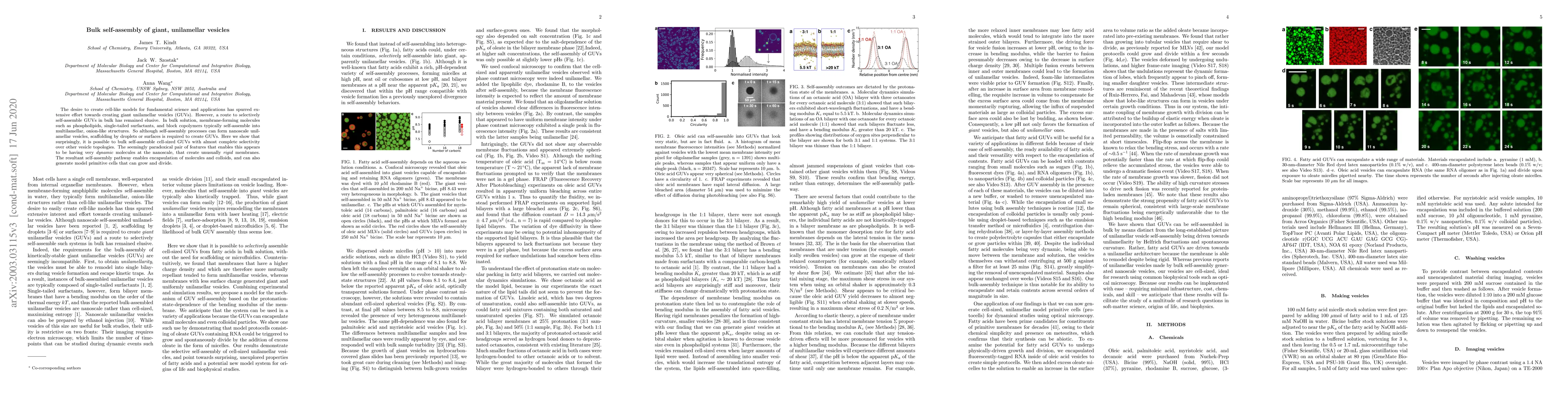 This paper demonstrates a novel method for bulk self-assembly of giant, unilamellar vesicles (GUVs) without the need for scaffolding, revealing a pathway enabled by dynamic nanoscale molecules that create rigid membranes. This method allows for the encapsulation of molecules and colloids, and can generate model primitive cells capable of growth and division.