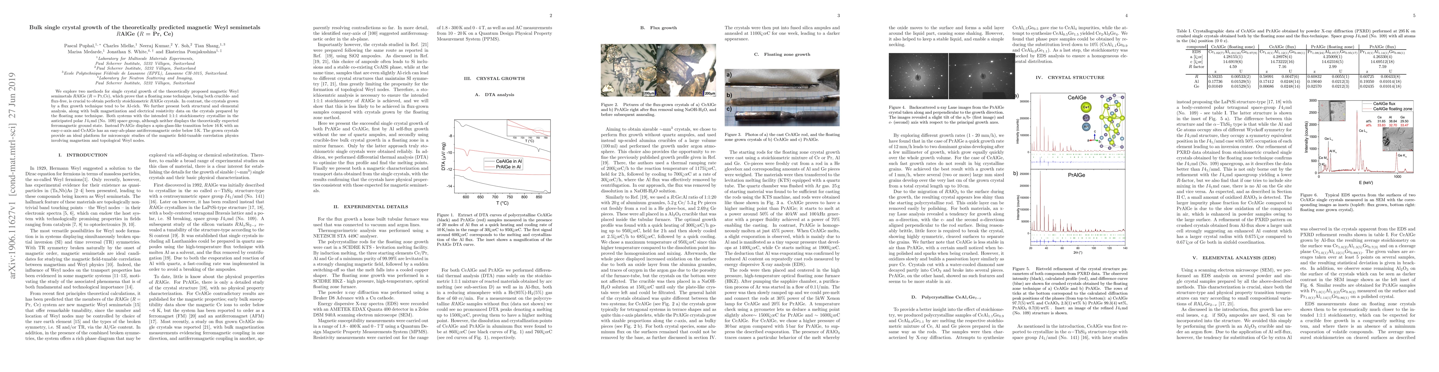 We explore two methods for single crystal growth of the theoretically proposed magnetic Weyl semimetals $R$AlGe ($R$ = Pr,Ce), which prove that a floating zone technique, being both crucible- and flux-free, is crucial to obtain perfectly stoichiometric $R$AlGe crystals. In contrast, the crystals grown by a flux growth technique tend to be Al-rich. We further present both structural and elemental analysis, along with bulk magnetization and electrical resistivity data on the crystals prepared by the floating zone technique. Both systems with the intended 1:1:1 stoichiometry crystallize in the anticipated polar I4$_{1}$md (No. 109) space group, although neither displays the theoretically expected ferromagnetic ground state. Instead PrAlGe displays a spin-glass-like transition below 16 K with an easy-c-axis and CeAlGe has an easy-ab-plane antiferromagnetic order below 5 K. The grown crystals provide an ideal platform for microscopic studies of the magnetic field-tunable correlation physics involving magnetism and topological Weyl nodes.