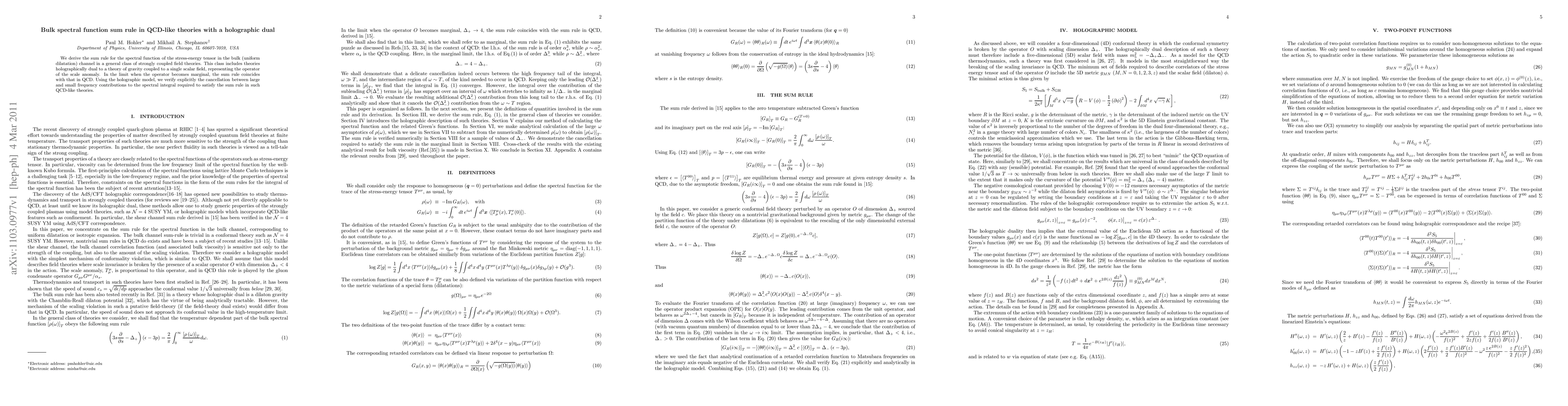 We derive the sum rule for the spectral function of the stress-energy tensor in the bulk (uniform dilatation) channel in a general class of strongly coupled field theories. This class includes theories holographically dual to a theory of gravity coupled to a single scalar field, representing the operator of the scale anomaly. In the limit when the operator becomes marginal, the sum rule coincides with that in QCD. Using the holographic model, we verify explicitly the cancellation between large and small frequency contributions to the spectral integral required to satisfy the sum rule in such QCD-like theories.