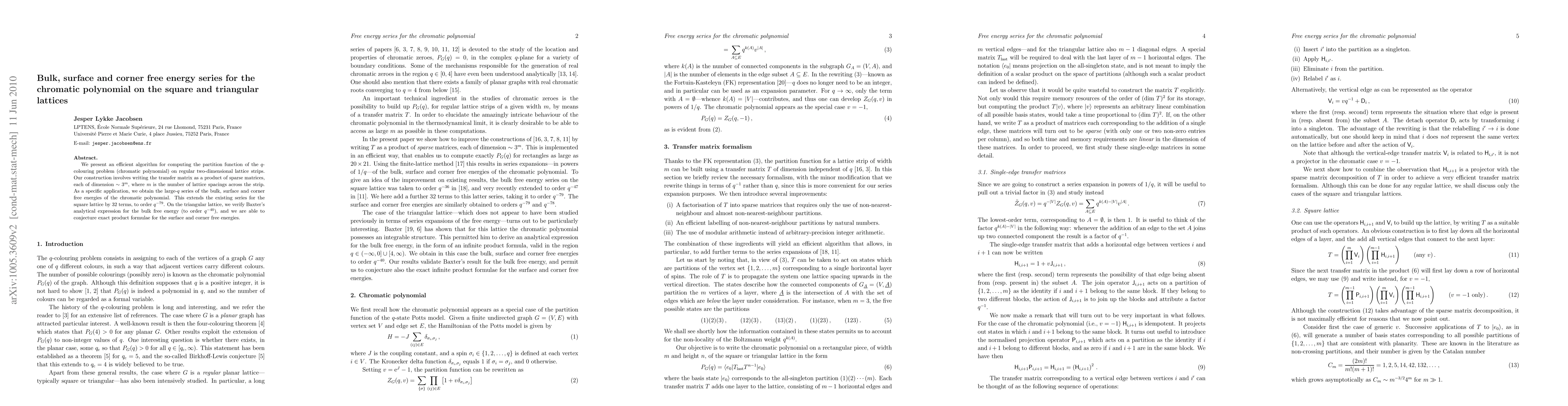 This paper presents an algorithm for computing the chromatic polynomial on lattice strips, extending the series for the square lattice by 32 terms and verifying Baxter's expression for the triangular lattice's bulk free energy, while also proposing new formulae for its surface and corner free energies.