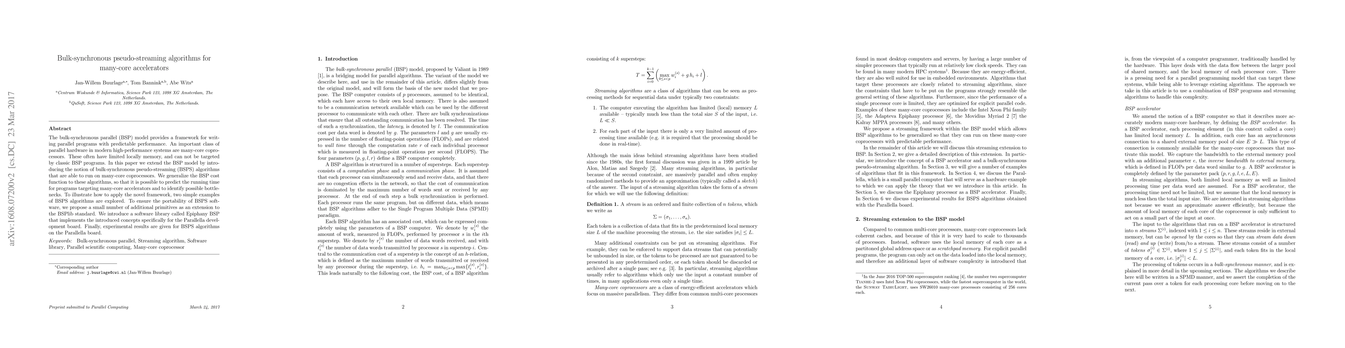 The bulk-synchronous parallel (BSP) model provides a framework for writing parallel programs with predictable performance. In this paper we extend the BSP model to support what we will call pseudo-streaming algorithms for accelerators. We also generalize the BSP cost function to these algorithms, so that it is possible to predict the running time for programs targeting many-core accelerators and to identify possible bottlenecks. Several examples of algorithms within this new framework will be explored. We extend the BSPlib standard by proposing a small number of new BSP primitives to create and use streams in a portable way. We will introduce a software library called Epiphany BSP that implements these ideas for the Parallella development board. Finally we will give experimental results for pseudo-streaming algorithms on the Parallella platform.