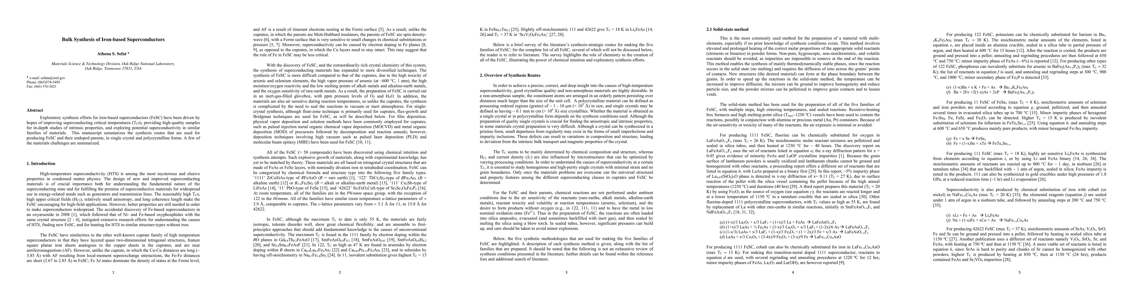 Exploratory synthesis efforts for iron-based superconductors (FeSC) have been driven by hopes of improving superconducting critical temperatures (TCs), providing high-quality samples for in-depth studies of intrinsic properties, and exploring potential superconductivity in similar families of materials. This manuscript summarizes the synthesis routes that are used for producing FeSC and their undoped parents, in single crystal and polycrystalline forms. A few of the materials challenges are summarized.