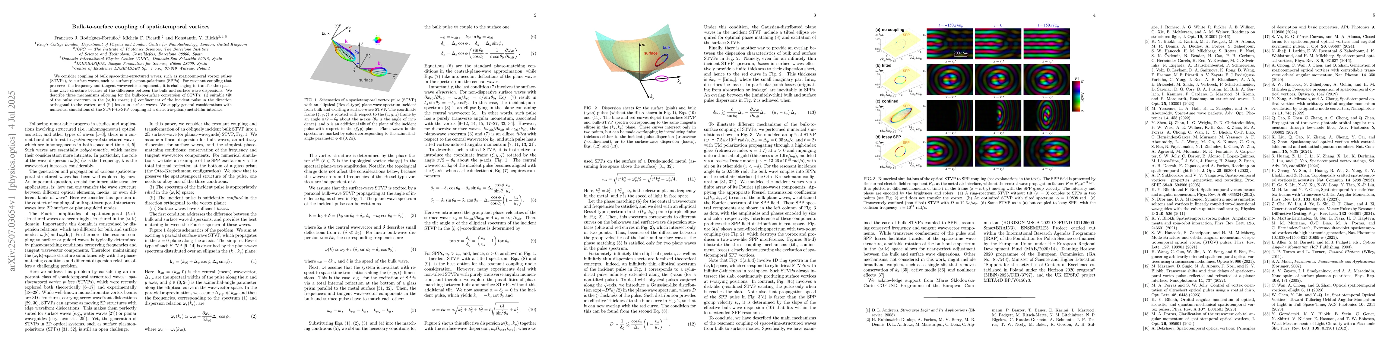 We consider coupling of bulk space-time-structured waves, such as spatiotemporal vortex pulses (STVPs), to surface waves, such as surface plasmon-polaritons (SPPs). For resonant coupling that preserves the frequency and tangent wavevector components, it is challenging to transfer the space-time wave structure because of the difference between the bulk and surface wave dispersions. We describe three mechanisms allowing for the bulk-to-surface conversion of STVPs: (i) suitable tilt of the pulse spectrum in the $(\omega,{\bf k})$ space; (ii) confinement of the incident pulse in the direction orthogonal to the vortex; and (iii) losses in surface waves. We supply general considerations with numerical simulations of the STVP-to-SPP coupling at a dielectric-prism/metal-film interface.
