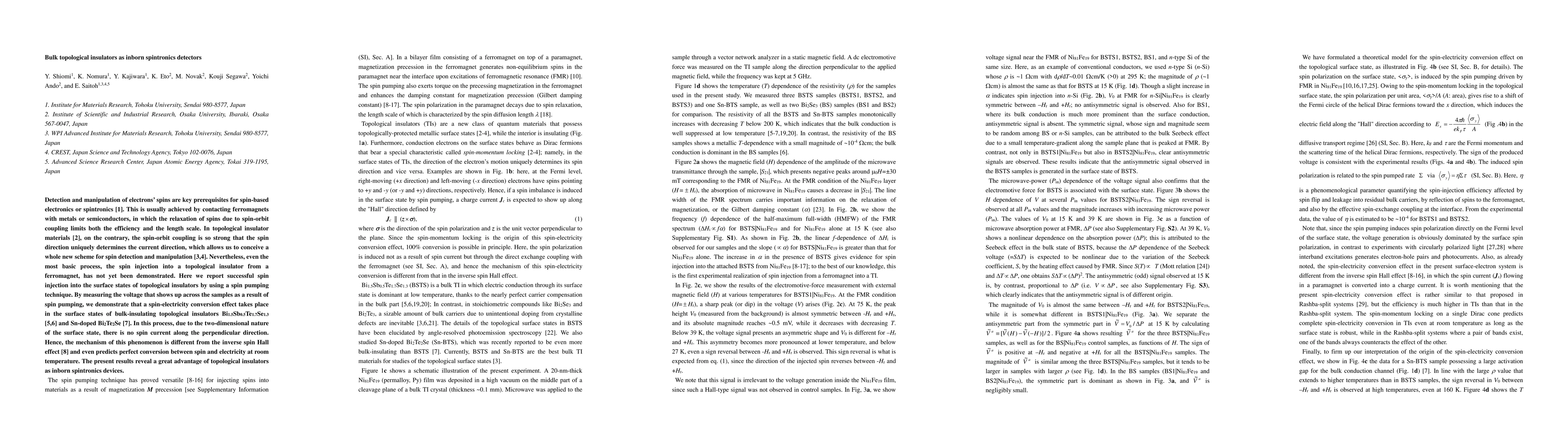 This paper demonstrates successful spin injection into the surface states of bulk topological insulators using a spin pumping technique, revealing a spin-electricity conversion effect in materials like Bi1.5Sb0.5Te1.7Se1.3 and Sn-doped Bi2Te2Se. This indicates topological insulators' potential as efficient spintronics detectors due to their unique spin-orbit coupling properties.