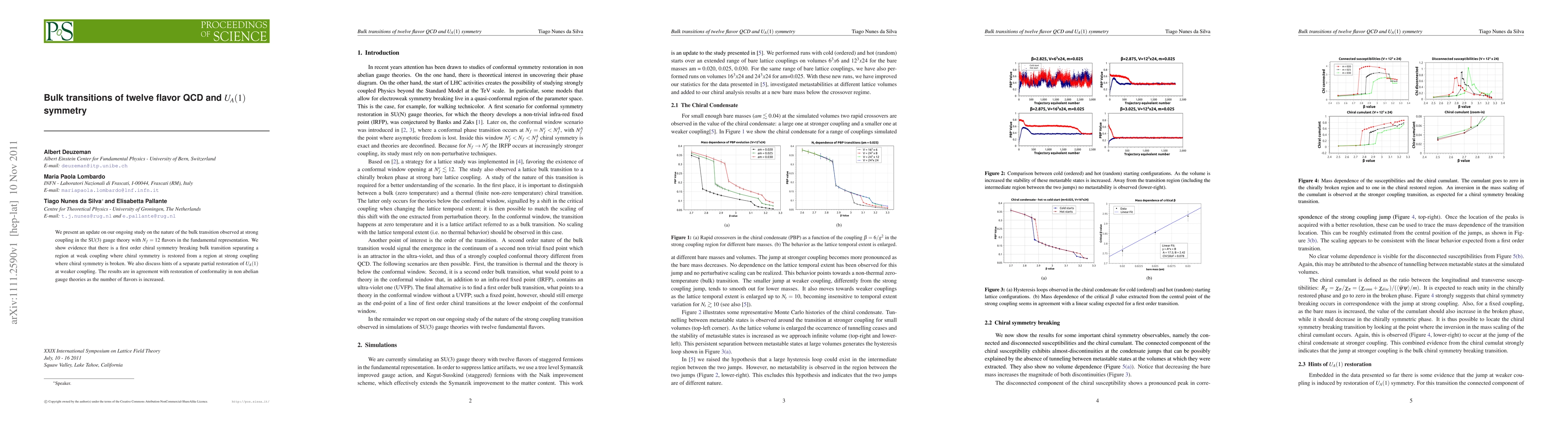We present an update on our ongoing study on the nature of the bulk transition observed at strong coupling in the SU(3) gauge theory with N_f = 12 flavors in the fundamental representation. We show evidence that there is a first order chiral symmetry breaking bulk transition separating a region at weak coupling where chiral symmetry is restored from a region at strong coupling where chiral symmetry is broken. We also discuss hints of a separate partial restoration of U_A(1) at weaker coupling. The results are in agreement with restoration of conformality in non abelian gauge theories as the number of flavors is increased.