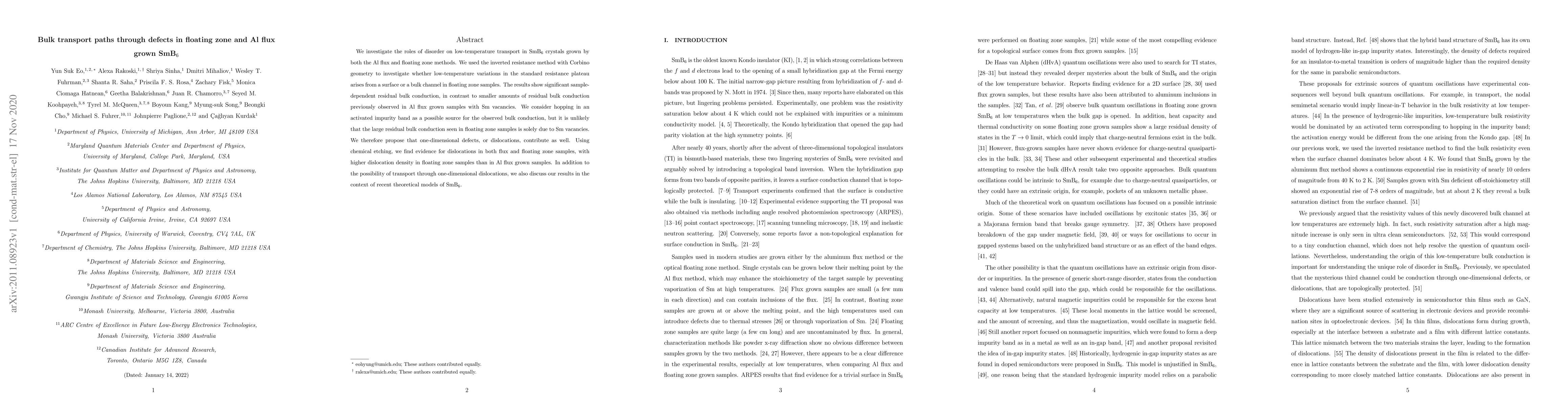 We investigate the roles of disorder on low-temperature transport in SmB$_6$ crystals grown by both the Al flux and floating zone methods. We used the inverted resistance method with Corbino geometry to investigate whether low-temperature variations in the standard resistance plateau arises from a surface or a bulk channel in floating zone samples. The results show significant sample-dependent residual bulk conduction, in contrast to smaller amounts of residual bulk conduction previously observed in Al flux grown samples with Sm vacancies. We consider hopping in an activated impurity band as a possible source for the observed bulk conduction, but it is unlikely that the large residual bulk conduction seen in floating zone samples is solely due to Sm vacancies. We therefore propose that one-dimensional defects, or dislocations, contribute as well. Using chemical etching, we find evidence for dislocations in both flux and floating zone samples, with higher dislocation density in floating zone samples than in Al flux grown samples. In addition to the possibility of transport through one-dimensional dislocations, we also discuss our results in the context of recent theoretical models of SmB$_6$.