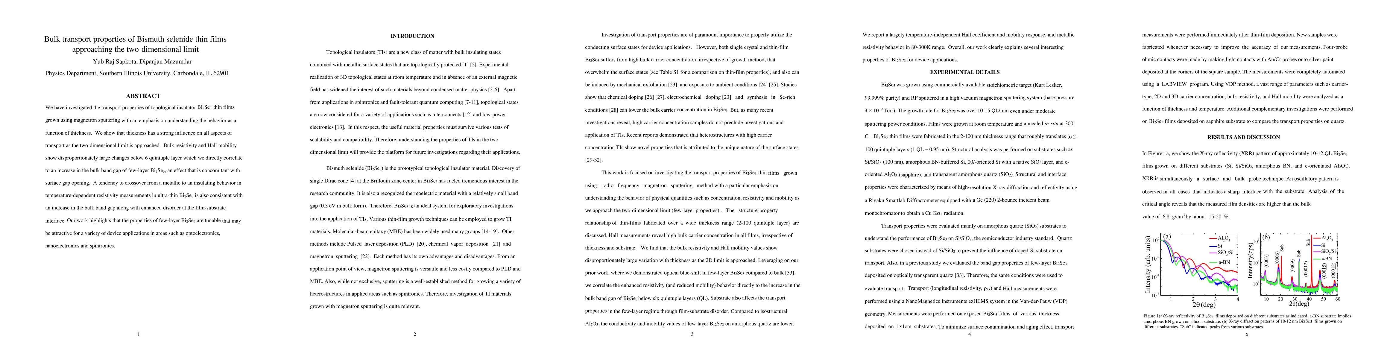 This study investigates the transport properties of Bi2Se3 thin films as their thickness approaches the two-dimensional limit, revealing significant changes in bulk resistivity and Hall mobility below 6 quintuple layers due to an increased bulk band gap. The findings suggest potential for tunable properties in few-layer Bi2Se3, making it suitable for optoelectronics, nanoelectronics, and spintronics applications.