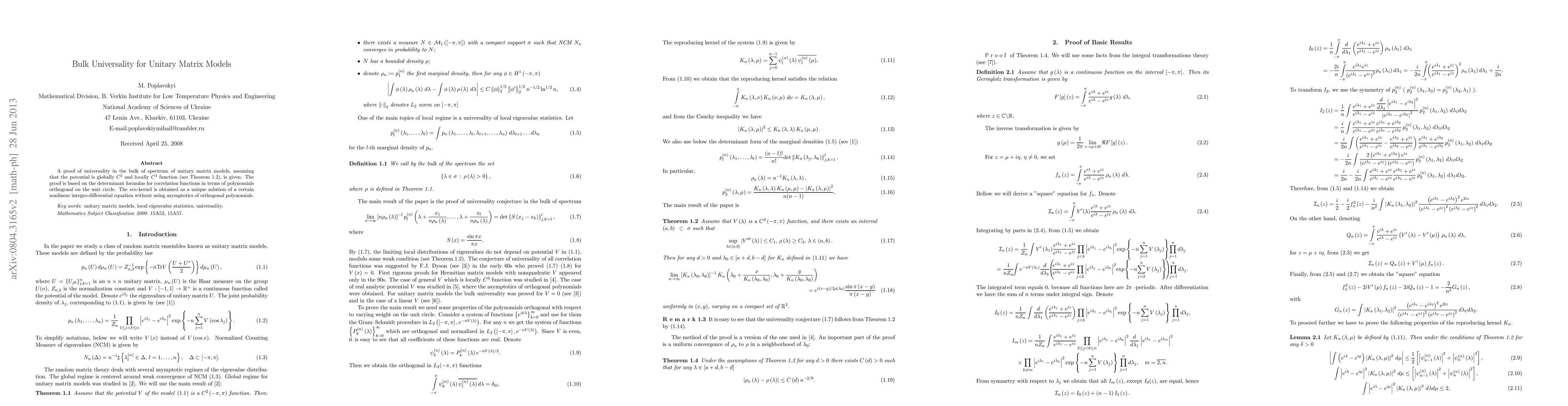 The paper proves bulk universality for unitary matrix models using determinant formulas for correlation functions and shows the $sin$-kernel as a solution to a non-linear integro-differential equation, without relying on orthogonal polynomials' asymptotics.