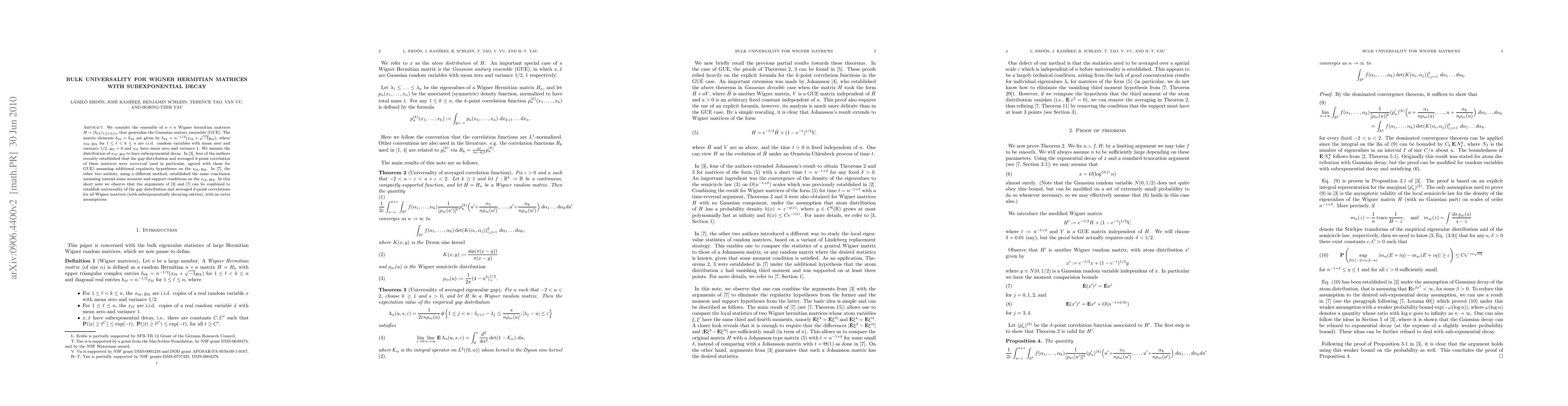 We consider the ensemble of $n \times n$ Wigner hermitian matrices $H = (h_{\ell k})_{1 \leq \ell,k \leq n}$ that generalize the Gaussian unitary ensemble (GUE). The matrix elements $h_{k\ell} = \bar h_{\ell k}$ are given by $h_{\ell k} = n^{-1/2} (x_{\ell k} + \sqrt{-1} y_{\ell k})$, where $x_{\ell k}, y_{\ell k}$ for $1 \leq \ell < k \leq n$ are i.i.d. random variables with mean zero and variance 1/2, $y_{\ell\ell}=0$ and $x_{\ell \ell}$ have mean zero and variance 1. We assume the distribution of $x_{\ell k}, y_{\ell k}$ to have subexponential decay. In a recent paper, four of the authors recently established that the gap distribution and averaged $k$-point correlation of these matrices were \emph{universal} (and in particular, agreed with those for GUE) assuming additional regularity hypotheses on the $x_{\ell k}, y_{\ell k}$. In another recent paper, the other two authors, using a different method, established the same conclusion assuming instead some moment and support conditions on the $x_{\ell k}, y_{\ell k}$. In this short note we observe that the arguments of these two papers can be combined to establish universality of the gap distribution and averaged $k$-point correlations for all Wigner matrices (with subexponentially decaying entries), with no extra assumptions.