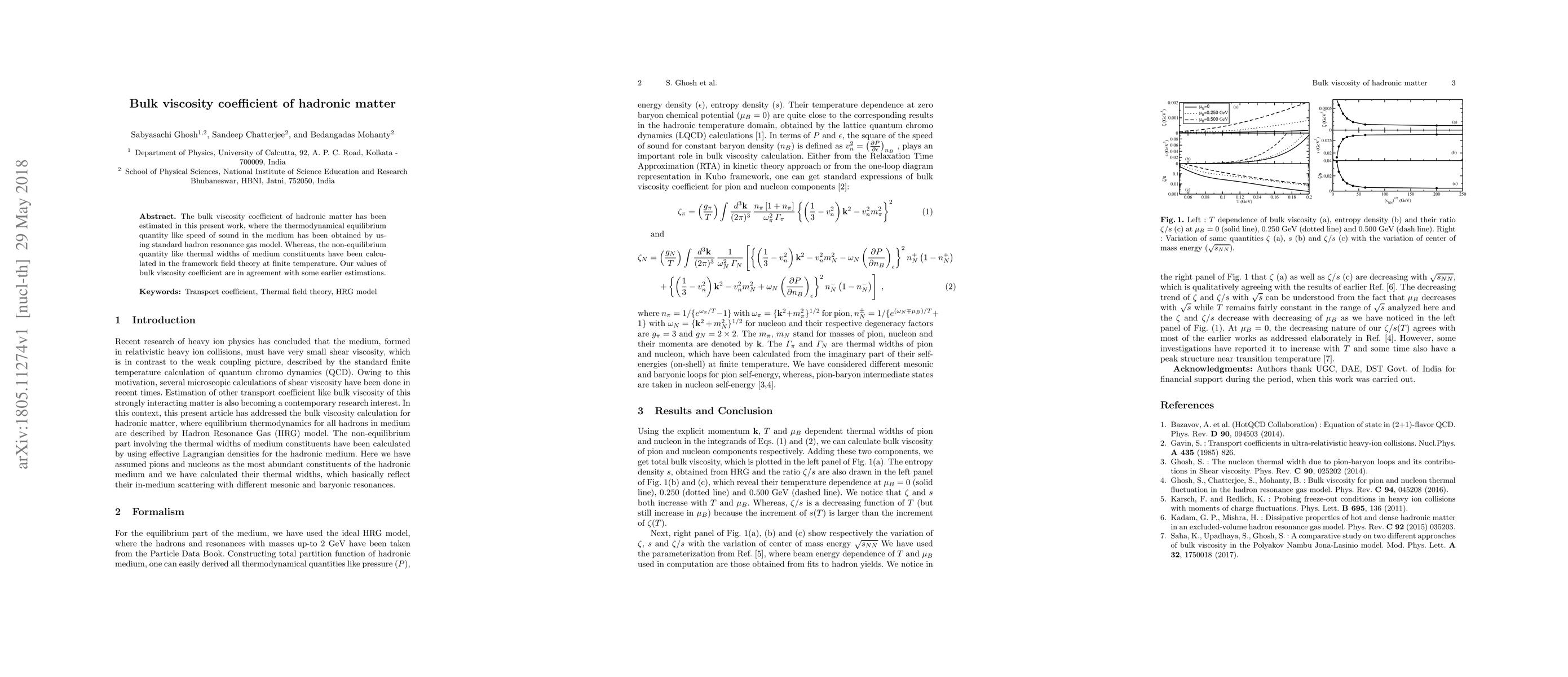 The bulk viscosity coefficient of hadronic matter has been estimated in this present work, where the thermodynamical equilibrium quantity like speed of sound in the medium has been obtained by using standard hadron resonance gas model. Whereas, the non-equilibrium quantity like thermal widths of medium constituents have been calculated in the framework field theory at finite temperature. Our values of bulk viscosity coefficient are in agreement with some earlier estimations.