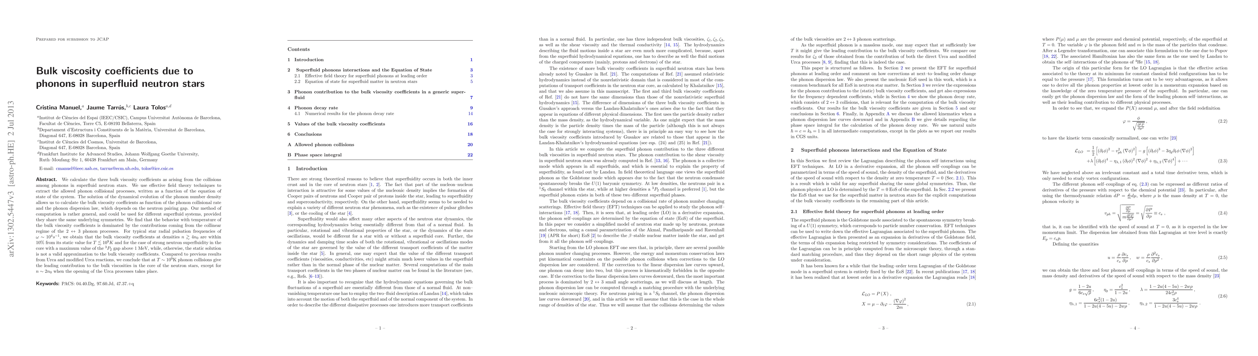 This paper calculates the bulk viscosity coefficients in superfluid neutron stars, arising from phonon collisions, using effective field theory. It finds that phonon collisions dominate the bulk viscosity behavior at temperatures around $10^9 K$, especially at densities above $4n_0$, and that the static solution is only valid under strong neutron superfluidity conditions.