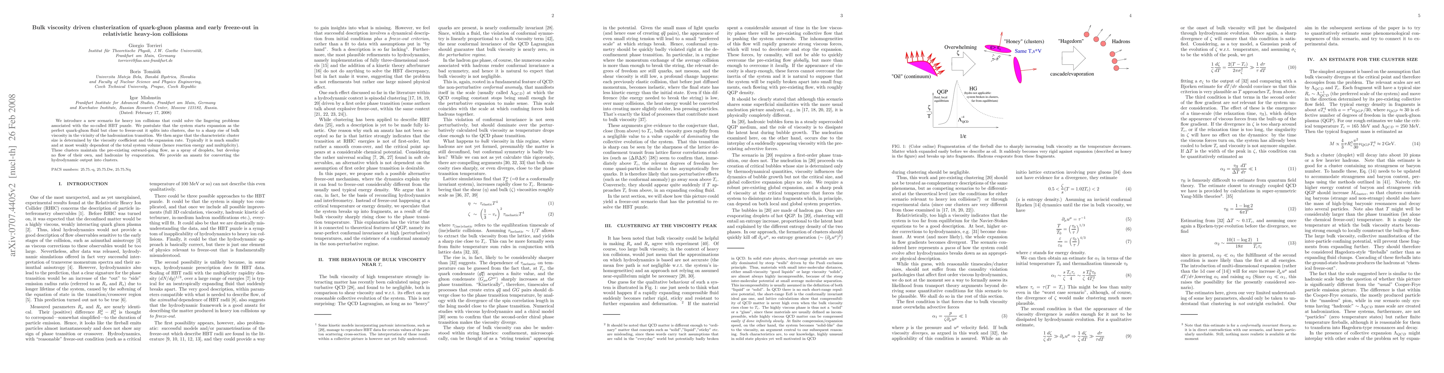 We introduce a new scenario for heavy ion collisions that could solve the lingering problems associated with the so-called HBT puzzle. We postulate that the system starts expansion as the perfect quark-gluon fluid but close to freeze-out it splits into clusters, due to a sharp rise of bulk viscosity in the vicinity of the hadronization transition. We then argue that the characteristic cluster size is determined by the viscosity coefficient and the expansion rate. Typically it is much smaller and independent of the total system volume. These clusters maintain the pre-existing outward-going flow, as a spray of droplets, but develop no flow of their own, and hadronize by evaporation. We provide an ansatz for converting the hydrodynamic output into clusters.
