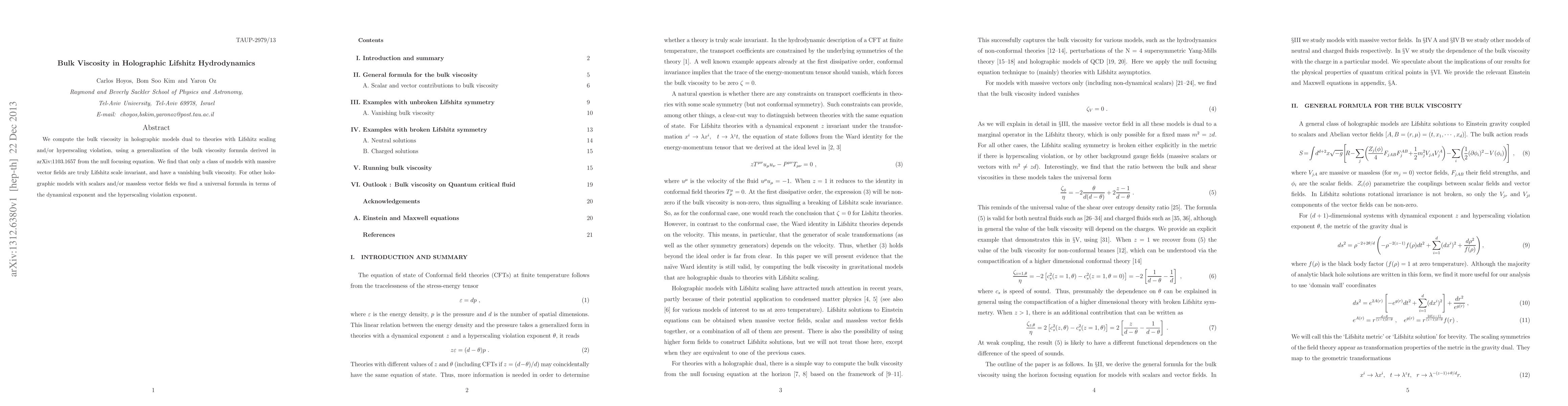 We compute the bulk viscosity in holographic models dual to theories with Lifshitz scaling and/or hyperscaling violation, using a generalization of the bulk viscosity formula derived in arXiv:1103.1657 from the null focusing equation. We find that only a class of models with massive vector fields are truly Lifshitz scale invariant, and have a vanishing bulk viscosity. For other holographic models with scalars and/or massless vector fields we find a universal formula in terms of the dynamical exponent and the hyperscaling violation exponent.