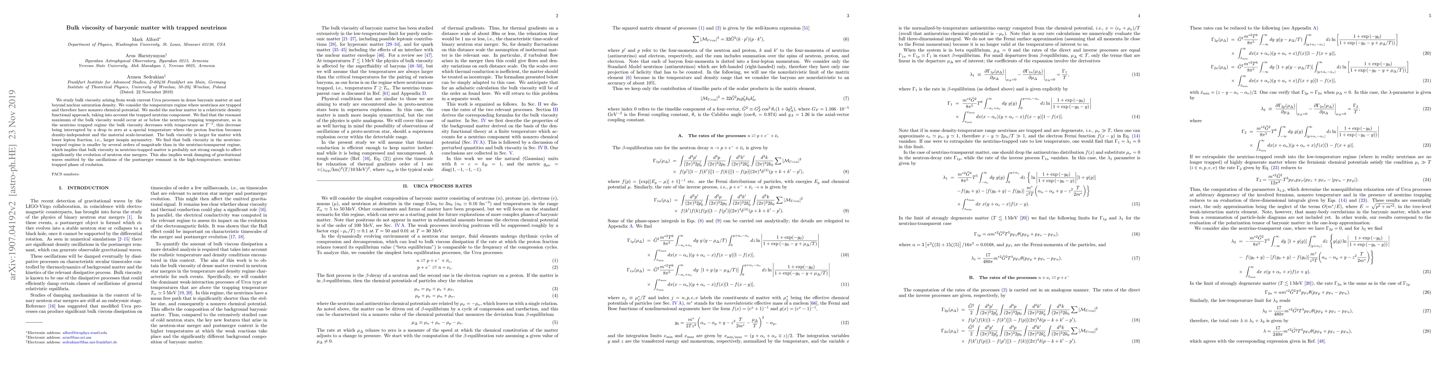 This study investigates bulk viscosity in dense baryonic matter with trapped neutrinos, finding that it decreases with temperature as $T^{-2}$ in the neutrino-trapped regime. The bulk viscosity is notably smaller in this regime compared to the neutrino-transparent regime, suggesting weak damping of gravitational waves from neutron star mergers.