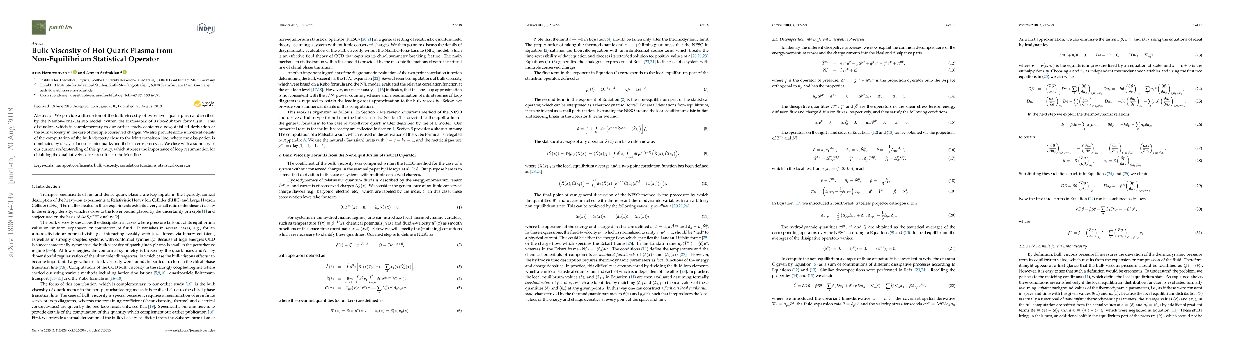 We provide a discussion of the bulk viscosity of two-flavor quark plasma, described by the Nambu--Jona-Lasinio model, within the framework of Kubo-Zubarev formalism. This discussion, which is complementary to our earlier study, contains a new, detailed derivation of the bulk viscosity in the case of multiple conserved charges. We also provide some numerical details of the computation of the bulk viscosity close to the Mott transition line, where the dissipation is dominated by decays of mesons into quarks and their inverse processes. We close with a summary of our current understanding of this quantity, which stresses the importance of loop resummation for obtaining the qualitatively correct result near the Mott line.