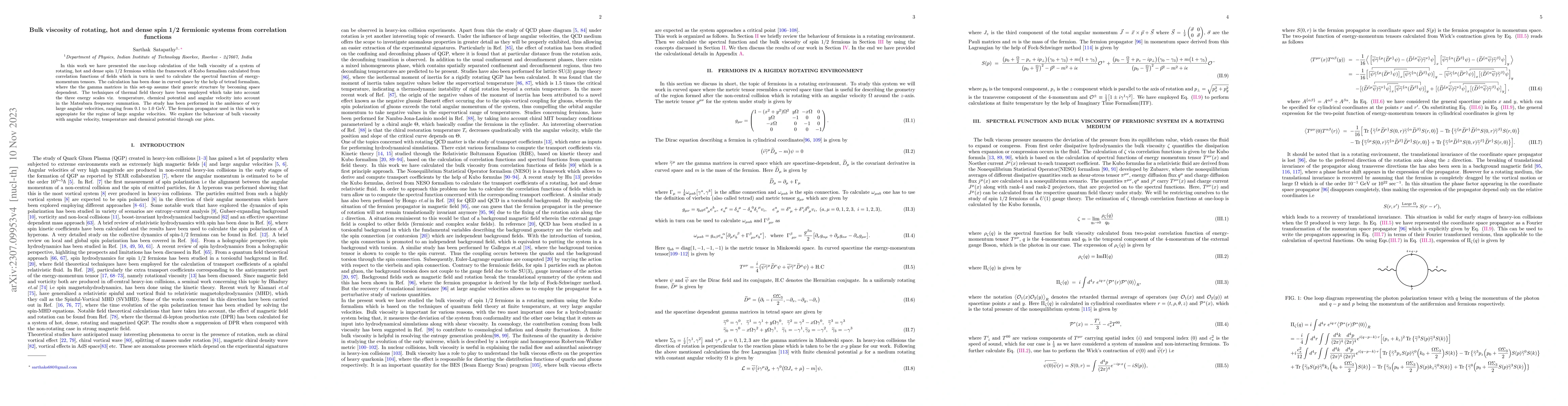 This paper calculates the bulk viscosity of rotating, hot, and dense spin 1/2 fermionic systems using one-loop perturbation theory within the Kubo formalism and thermal field theory. The study explores the behavior of bulk viscosity across various energy scales and large angular velocities.