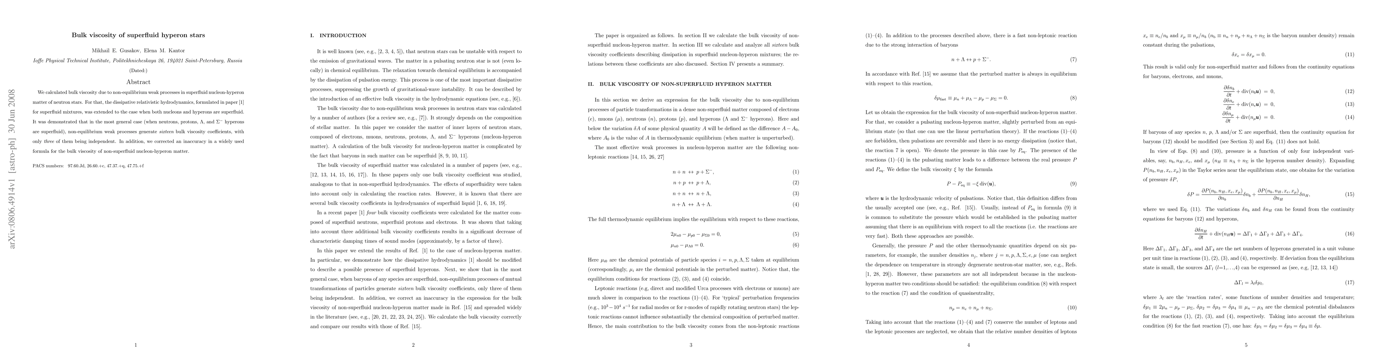 This paper calculates the bulk viscosity in superfluid nucleon-hyperon matter of neutron stars, extending dissipative relativistic hydrodynamics to include superfluid nucleons and hyperons. It identifies sixteen bulk viscosity coefficients, of which only three are independent, and corrects an existing formula for non-superfluid matter.