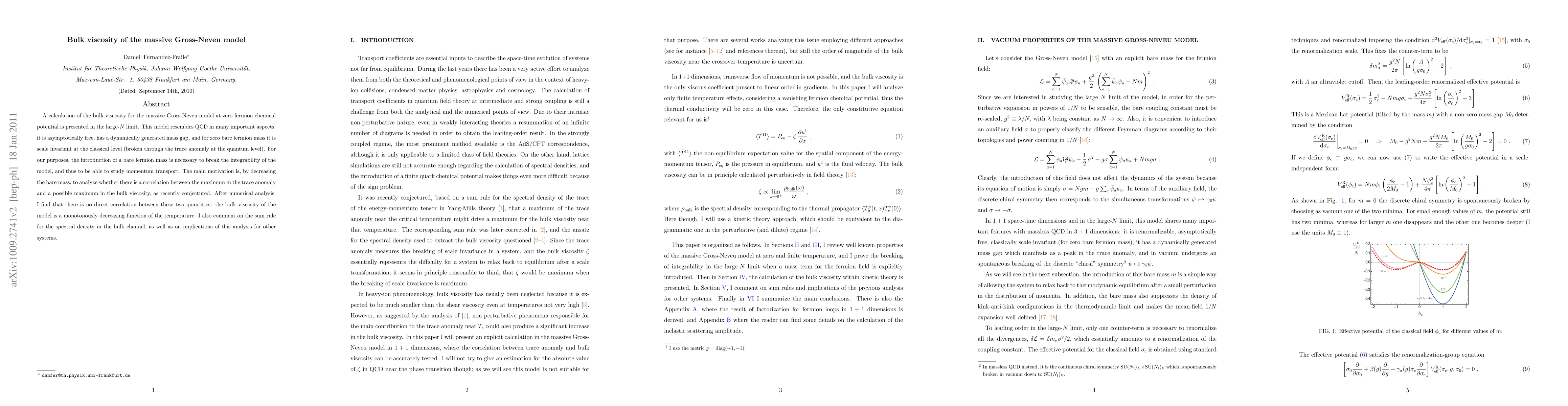 A calculation of the bulk viscosity for the massive Gross-Neveu model at zero fermion chemical potential is presented in the large-$N$ limit. This model resembles QCD in many important aspects: it is asymptotically free, has a dynamically generated mass gap, and for zero bare fermion mass it is scale invariant at the classical level (broken through the trace anomaly at the quantum level). For our purposes, the introduction of a bare fermion mass is necessary to break the integrability of the model, and thus to be able to study momentum transport. The main motivation is, by decreasing the bare mass, to analyze whether there is a correlation between the maximum in the trace anomaly and a possible maximum in the bulk viscosity, as recently conjectured. After numerical analysis, I find that there is no direct correlation between these two quantities: the bulk viscosity of the model is a monotonously decreasing function of the temperature. I also comment on the sum rule for the spectral density in the bulk channel, as well as on implications of this analysis for other systems.