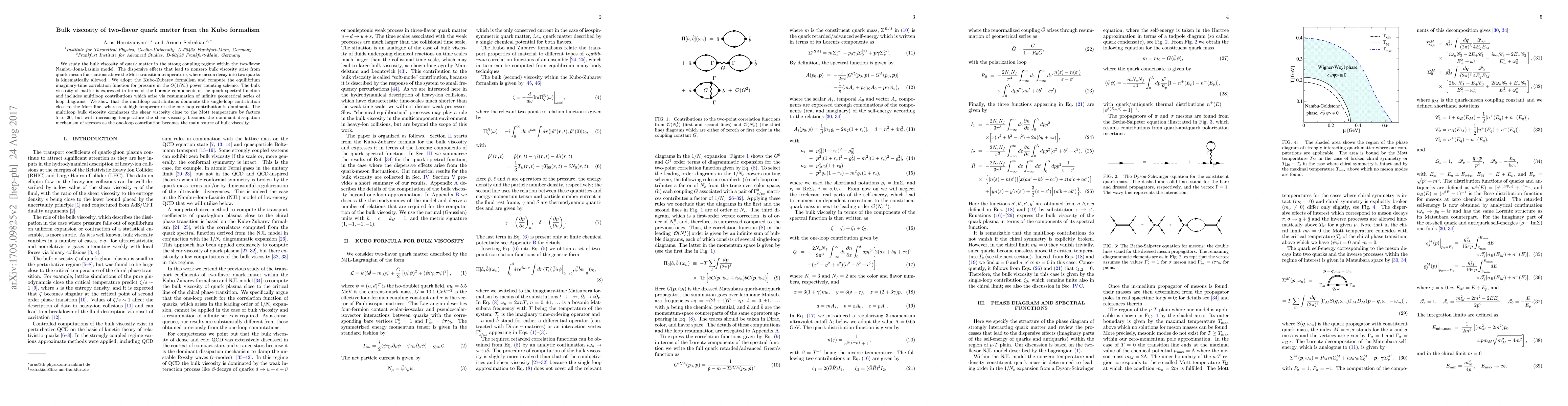 The paper presents a comprehensive derivation and calculation of bulk viscosity within the two-flavor Nambu--Jona-Lasinio (NJL) model using the Kubo-Zubarev formalism, highlighting the dominance of multi-loop contributions over single-loop ones near the Mott temperature and the dominance of bulk viscosity over shear viscosity in certain parameter regimes.