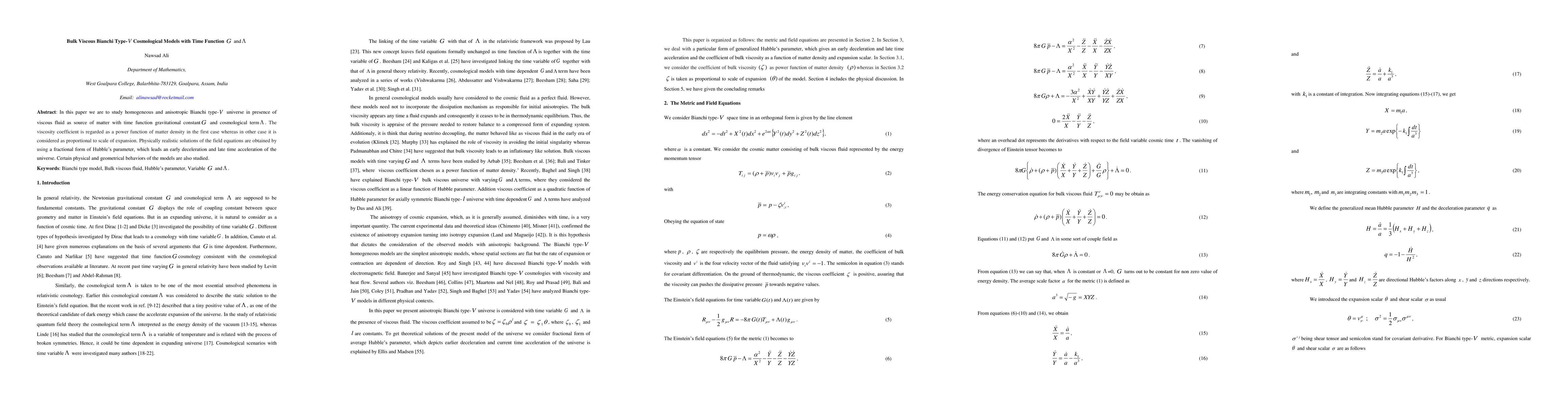 This paper investigates a homogeneous and anisotropic Bianchi type-V cosmological model with bulk viscous fluid, variable gravitational constant G, and cosmological term lambda. Solutions are derived using a fractional form of Hubble's parameter, showing early deceleration followed by late-time acceleration, and examining the physical and geometrical behaviors of the model.
