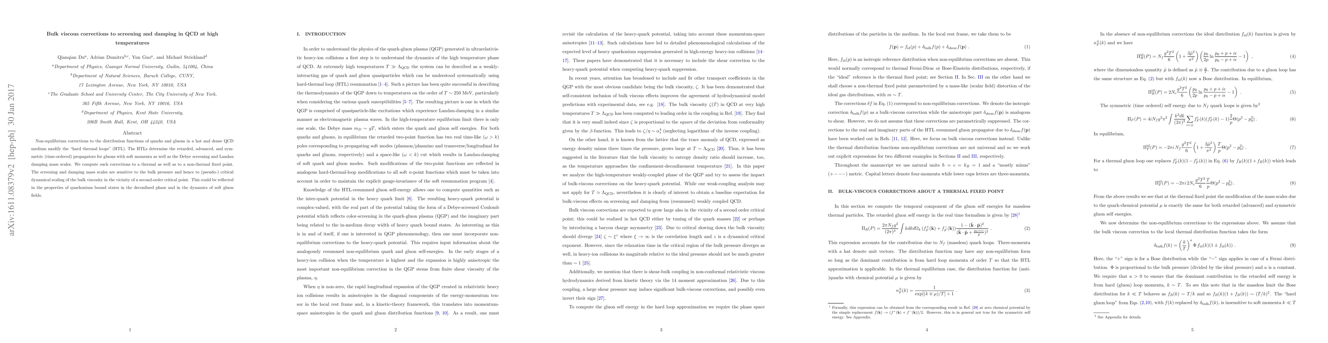 This paper investigates how bulk viscous corrections affect the screening and damping in Quantum Chromodynamics (QCD) at high temperatures, focusing on the modifications to the "hard thermal loops" and their impact on the propagators, Debye screening, and Landau damping. The study reveals that these corrections are sensitive to the bulk pressure and bulk viscosity near a critical point, potentially influencing quarkonium states and soft gluon dynamics.