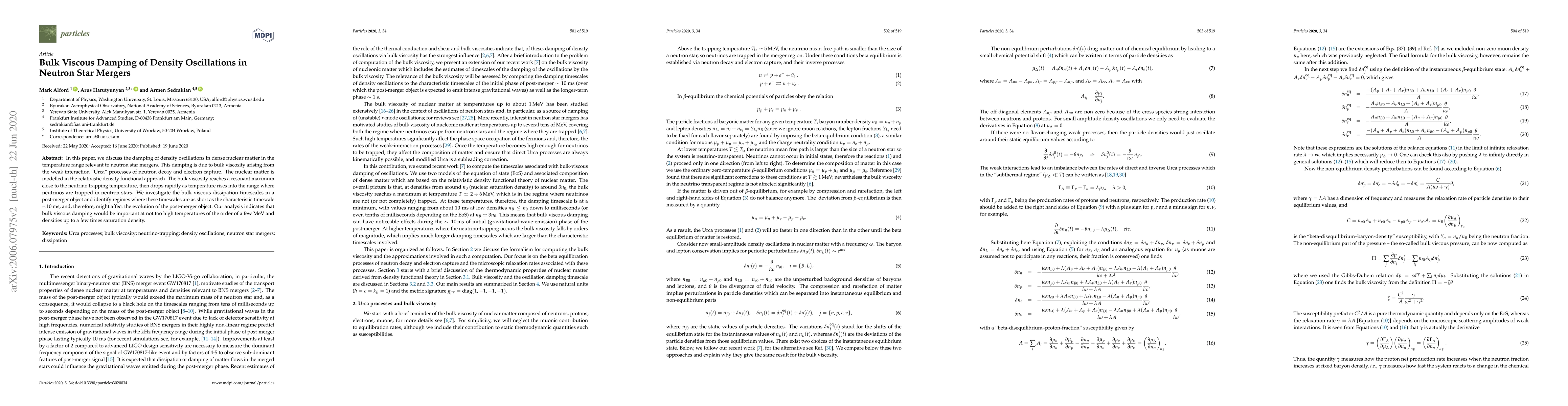 This paper investigates the damping of density oscillations in neutron star mergers due to bulk viscosity from weak interaction processes, finding that it reaches a maximum near the neutrino trapping temperature and significantly impacts the evolution of post-merger objects at temperatures around a few MeV and densities close to saturation.