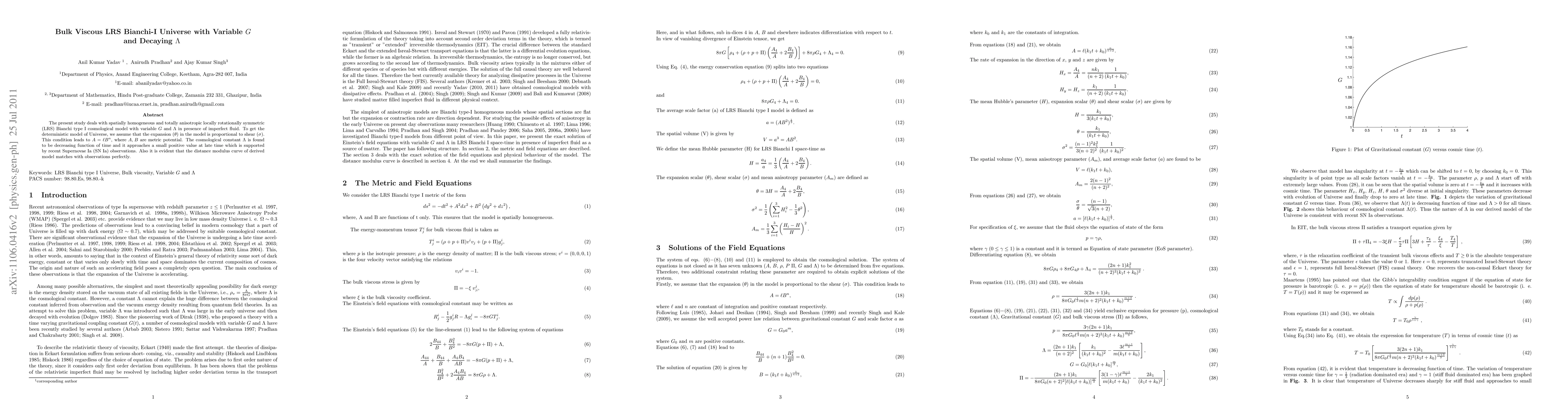 This paper explores a spatially homogeneous and anisotropic LRS Bianchi type I cosmological model with variable gravitational constant $G$ and decaying cosmological constant $\Lambda$, using a bulk viscous fluid. The model's expansion is proportional to shear, leading to a metric potential relationship, and it aligns with recent Supernovae Ia observations, showing $\Lambda$ approaching a small positive value at late times.