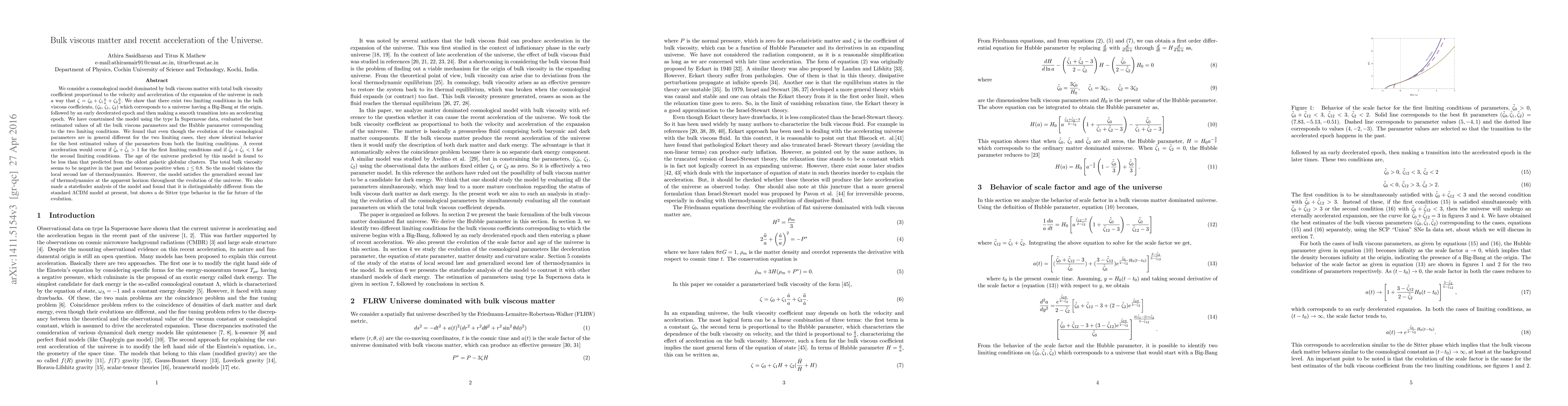 We consider a cosmological model dominated by bulk viscous matter with total bulk viscosity coefficient proportional to the velocity and acceleration of the expansion of the universe in such a way that $\zeta=\zeta_{0}+\zeta_{1}\frac{\dot{a}}{a}+\zeta_{2}\frac{\ddot{a}}{\dot{a}}.$ We show that there exist two limiting conditions in the bulk viscous coefficients, ($\zeta_{0}$, $\zeta_{1}$, $\zeta_{2}$) which corresponds to a universe having a Big-Bang at the origin, followed by an early decelerated epoch and then making a smooth transition into an accelerating epoch. We have constrained the model using the type Ia Supernovae data, evaluated the best estimated values of all the bulk viscous parameters and the Hubble parameter corresponding to the two limiting conditions. We found that even though the evolution of the cosmological parameters are in general different for the two limiting cases, they show identical behavior for the best estimated values of the parameters from both the limiting conditions. A recent acceleration would occur if $\tilde{\zeta}_{0}+\tilde{\zeta}_{1}>1$ for the first limiting conditions and if $\tilde{\zeta}_{0}+\tilde{\zeta}_{1}<1$ for the second limiting conditions. The age of the universe predicted by this model is found to be less than that predicted from the oldest galactic globular clusters. The total bulk viscosity seems to be negative in the past and becomes positive when $z\leq0.8$. So the model violates the local second law of thermodynamics. However, the model satisfies the generalized second law of thermodynamics at the apparent horizon throughout the evolution of the universe. We also made a statefinder analysis of the model and found that it is distinguishably different from the standard $\Lambda$CDM model at present, but shows a de Sitter type behavior in the far future of the evolution.