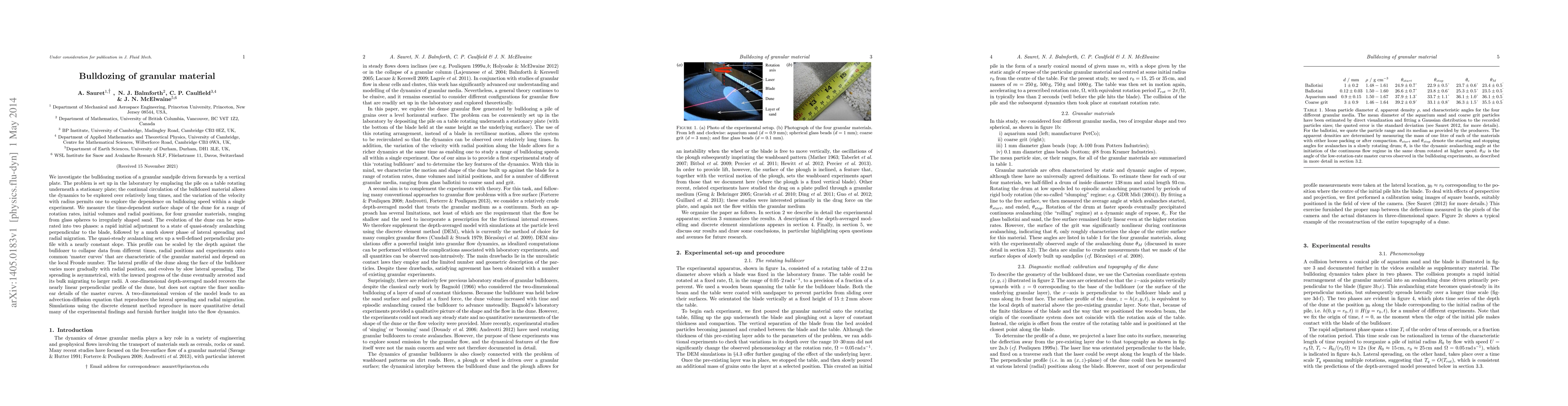Researchers studied how a bulldozer moves granular material in a controlled lab experiment, finding two distinct phases: rapid avalanching followed by slow lateral spreading and radial migration of the material.