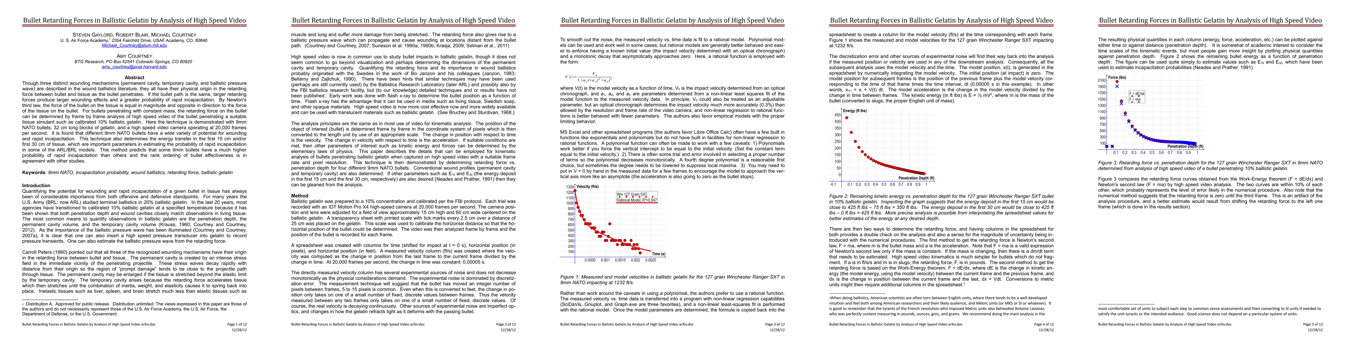 Though three distinct wounding mechanisms (permanent cavity, temporary cavity, and ballistic pressure wave) are described in the wound ballistics literature, they all have their physical origin in the retarding force between bullet and tissue as the bullet penetrates. If the bullet path is the same, larger retarding forces produce larger wounding effects and a greater probability of rapid incapacitation. By Newton's third law, the force of the bullet on the tissue is equal in magnitude and opposite in direction to the force of the tissue on the bullet. For bullets penetrating with constant mass, the retarding force on the bullet can be determined by frame by frame analysis of high speed video of the bullet penetrating a suitable tissue simulant such as calibrated 10% ballistic gelatin. Here the technique is demonstrated with 9mm NATO bullets, 32 cm long blocks of gelatin, and a high speed video camera operating at 20,000 frames per second. It is found that different 9mm NATO bullets have a wide variety of potential for wounding and rapid incapacitation. This technique also determines the energy transfer in the first 15 cm and/or first 30 cm of tissue, which are important parameters in estimating the probability of rapid incapacitation in some of the ARL/BRL models. This method predicts that some 9mm bullets have a much higher probability of rapid incapacitation than others and the rank ordering of bullet effectiveness is in agreement with other studies.