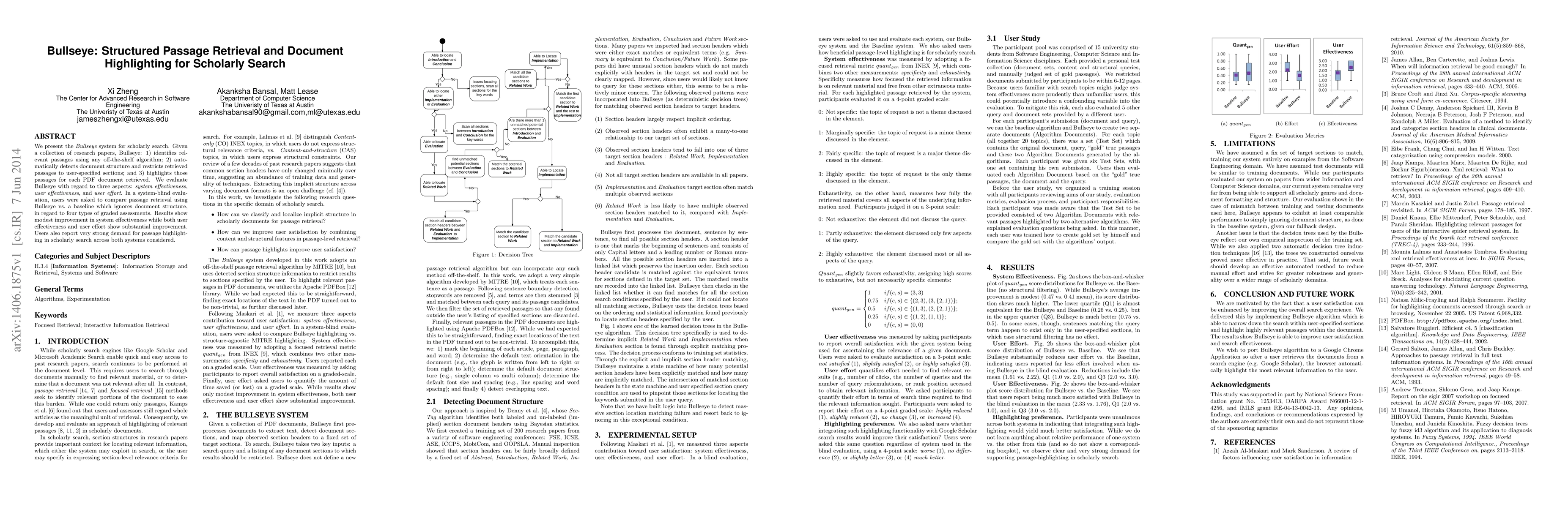 Bullseye system enhances scholarly search by identifying relevant passages, restricting retrieval to specified document sections, and highlighting passages. Evaluations show modest gains in system effectiveness but significant improvements in user effectiveness and reduced effort, with strong user preference for passage highlighting.