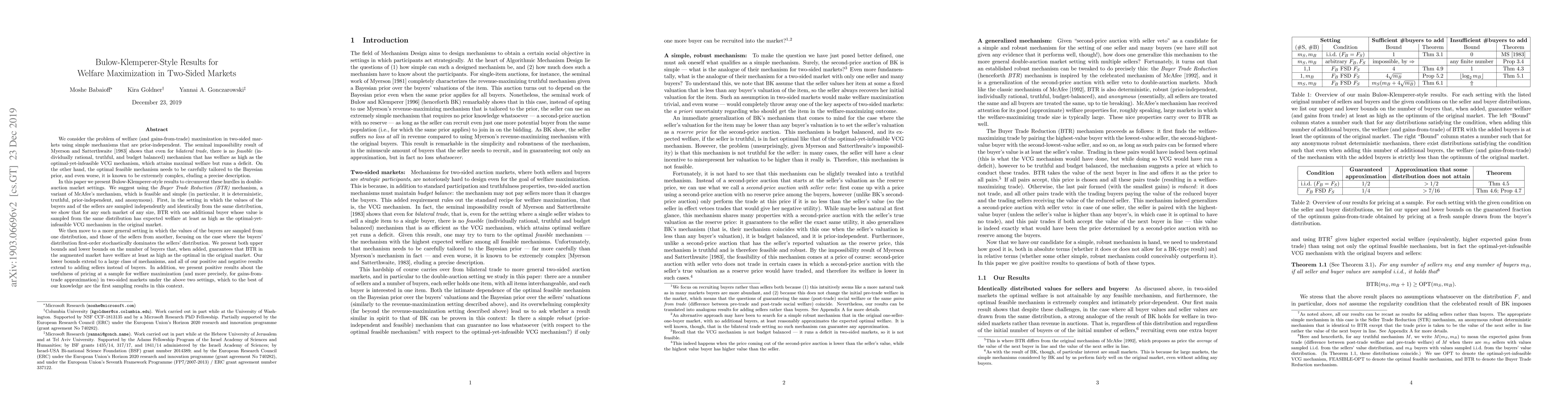 We consider the problem of welfare maximization in two-sided markets using simple mechanisms that are prior-independent. The Myerson-Satterthwaite impossibility theorem shows that even for bilateral trade, there is no feasible (IR, truthful, budget balanced) mechanism that has welfare as high as the optimal-yet-infeasible VCG mechanism, which attains maximal welfare but runs a deficit. On the other hand, the optimal feasible mechanism needs to be carefully tailored to the Bayesian prior, and is extremely complex, eluding a precise description. We present Bulow-Klemperer-style results to circumvent these hurdles in double-auction markets. We suggest using the Buyer Trade Reduction (BTR) mechanism, a variant of McAfee's mechanism, which is feasible and simple (in particular, deterministic, truthful, prior-independent, anonymous). First, in the setting where buyers' and sellers' values are sampled i.i.d. from the same distribution, we show that for any such market of any size, BTR with one additional buyer whose value is sampled from the same distribution has expected welfare at least as high as the optimal in the original market. We then move to a more general setting where buyers' values are sampled from one distribution and sellers' from another, focusing on the case where the buyers' distribution first-order stochastically dominates the sellers'. We present bounds on the number of buyers that, when added, guarantees that BTR in the augmented market have welfare at least as high as the optimal in the original market. Our lower bounds extend to a large class of mechanisms, and all of our results extend to adding sellers instead of buyers. In addition, we present positive results about the usefulness of pricing at a sample for welfare maximization in two-sided markets under the above two settings, which to the best of our knowledge are the first sampling results in this context.