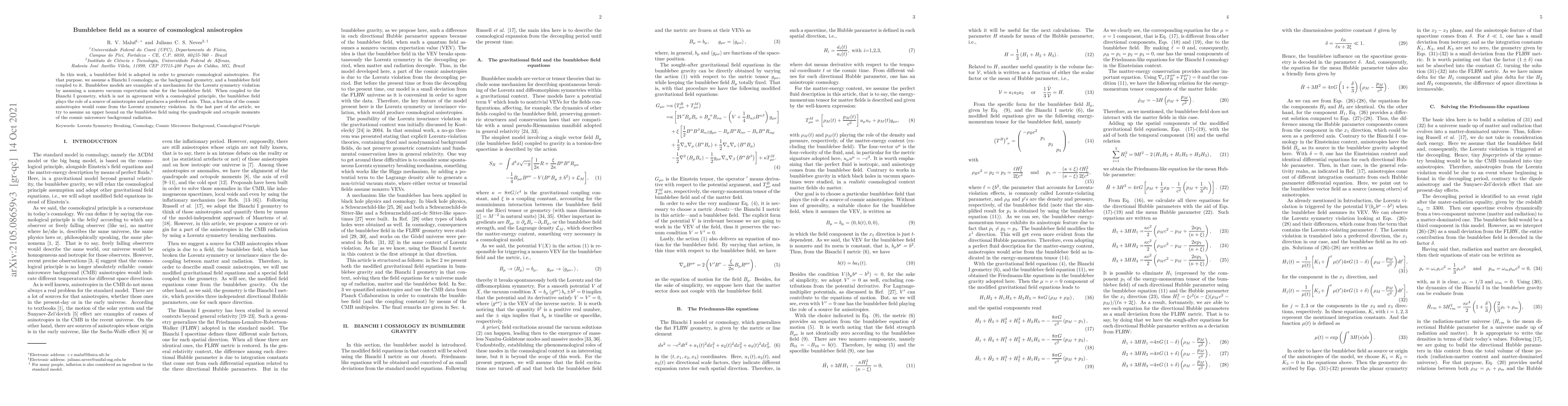This paper explores how a bumblebee field can generate cosmological anisotropies in a Bianchi I cosmology, suggesting that Lorentz symmetry violation through a nonzero vacuum expectation value of the bumblebee field creates a preferred axis. An upper bound for the bumblebee field is estimated using cosmic microwave background radiation moments.